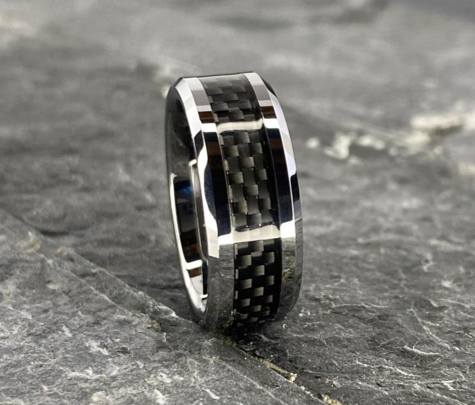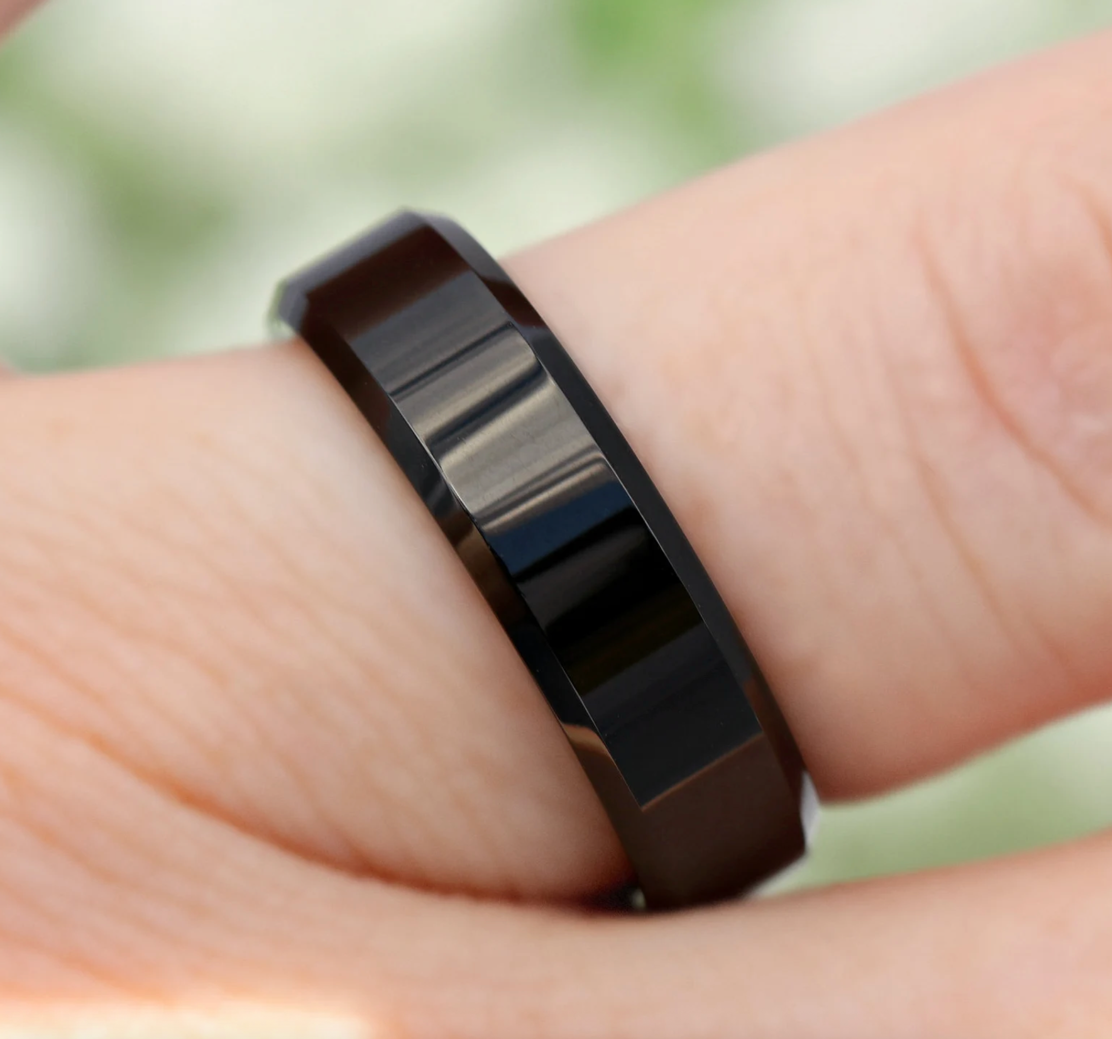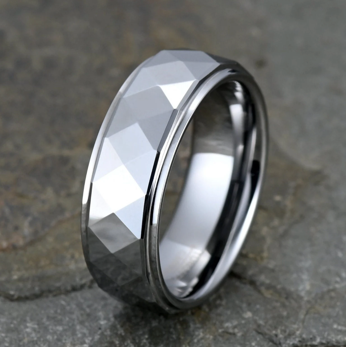 C: Faceted Tungsten Ring: Polished Silver Gray Men's Wedding Band