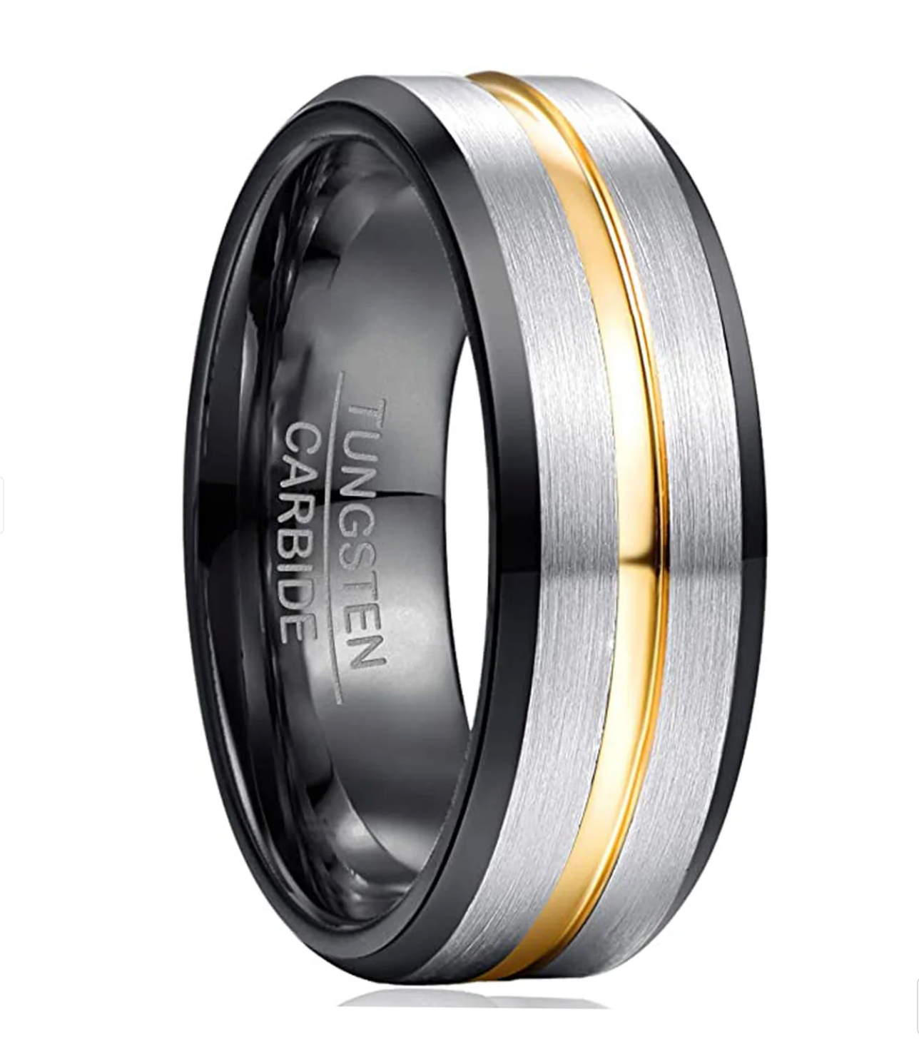D: Black Tungsten Ring Silver Brush With Gold Groove