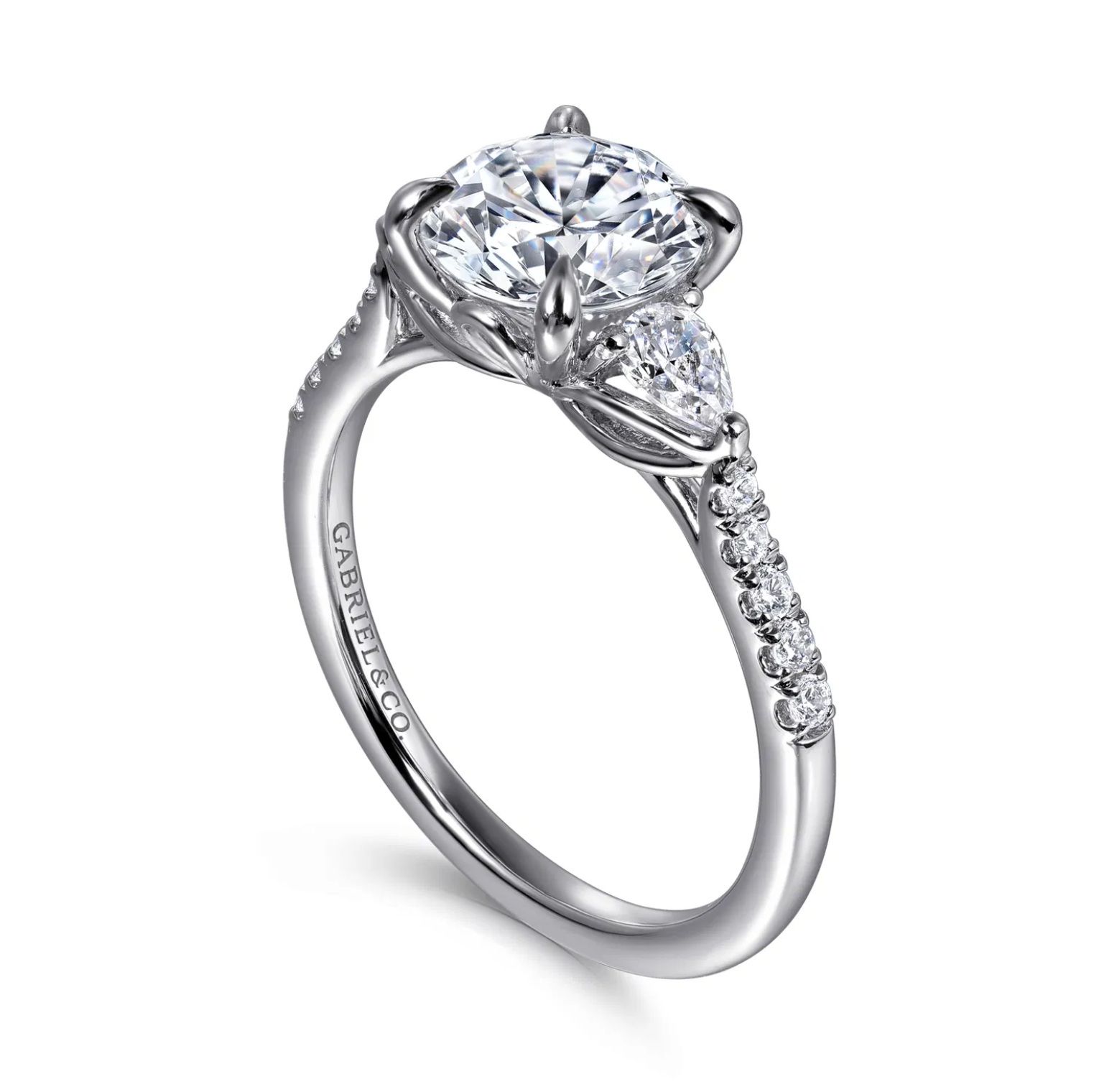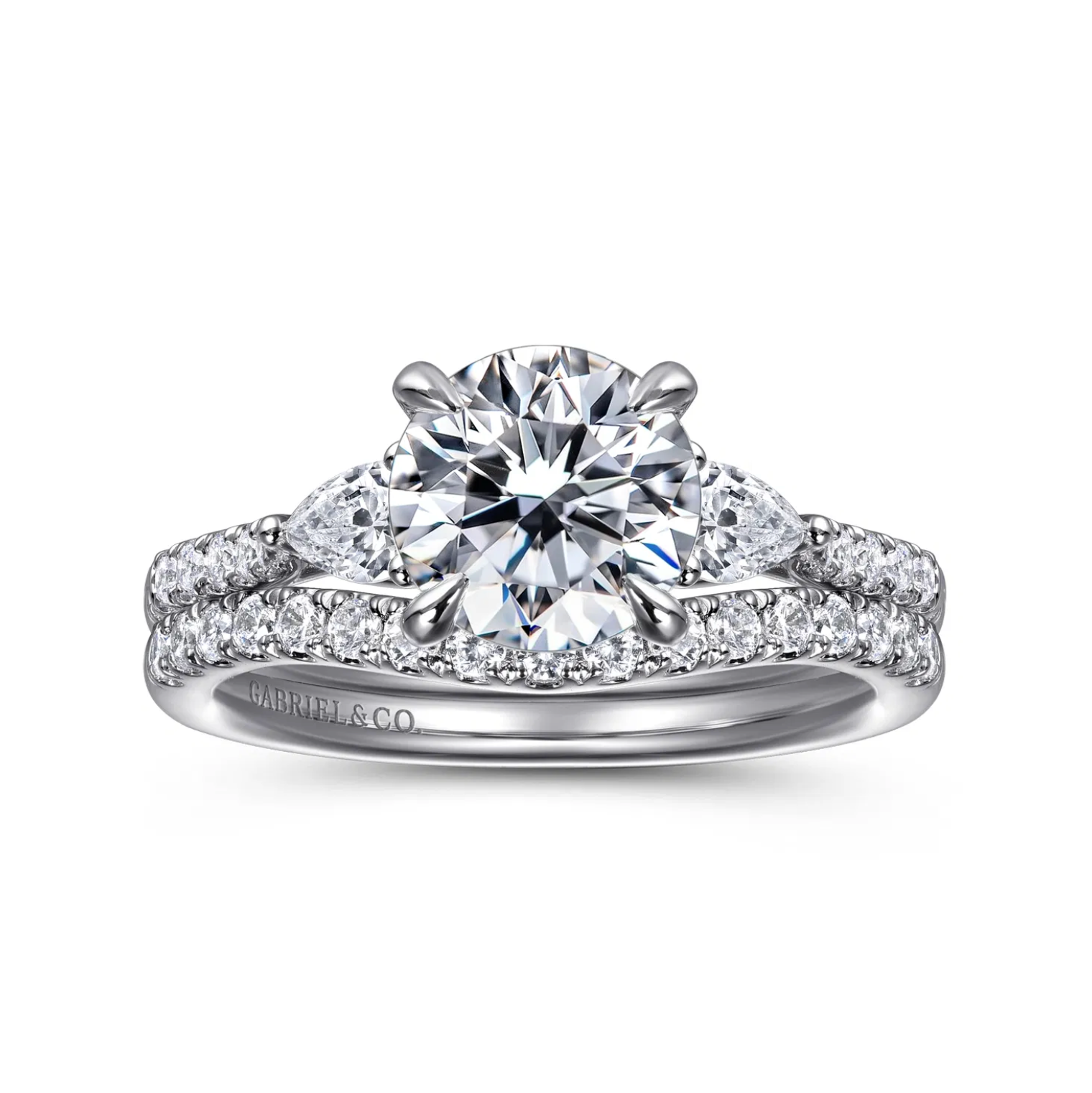 Expertly crafted from radiant 14K white gold, this three-stone engagement ring is a masterpiece. The diamond straight band creates a contemporary and sleek foundation for this enchanting piece. The lotus gallery adds an artistic flourish, elevating the overall design. This captivating ring features a 3-stone arrangement, showcasing a substantial 1.5 ct round center stone paired with exquisite pear-shaped side stones. With an additional 0.33 ct of diamonds gracing the band, each facet becomes a luminous celebration of your love.