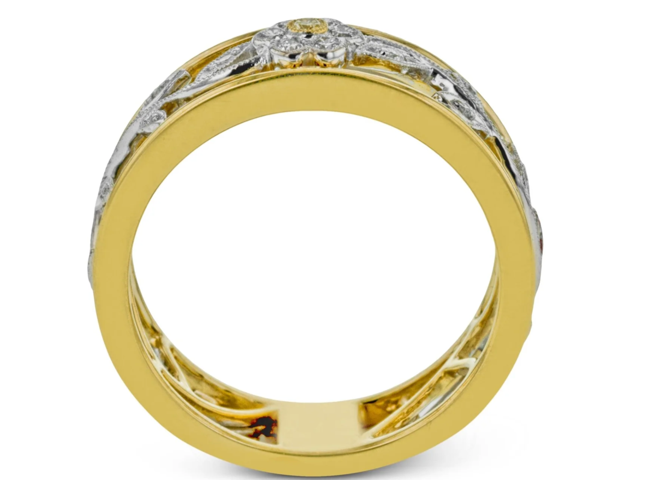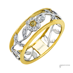 This eye-catching, vintage-style ring features an elegant floral design accentuated by dazzling white and yellow diamonds.