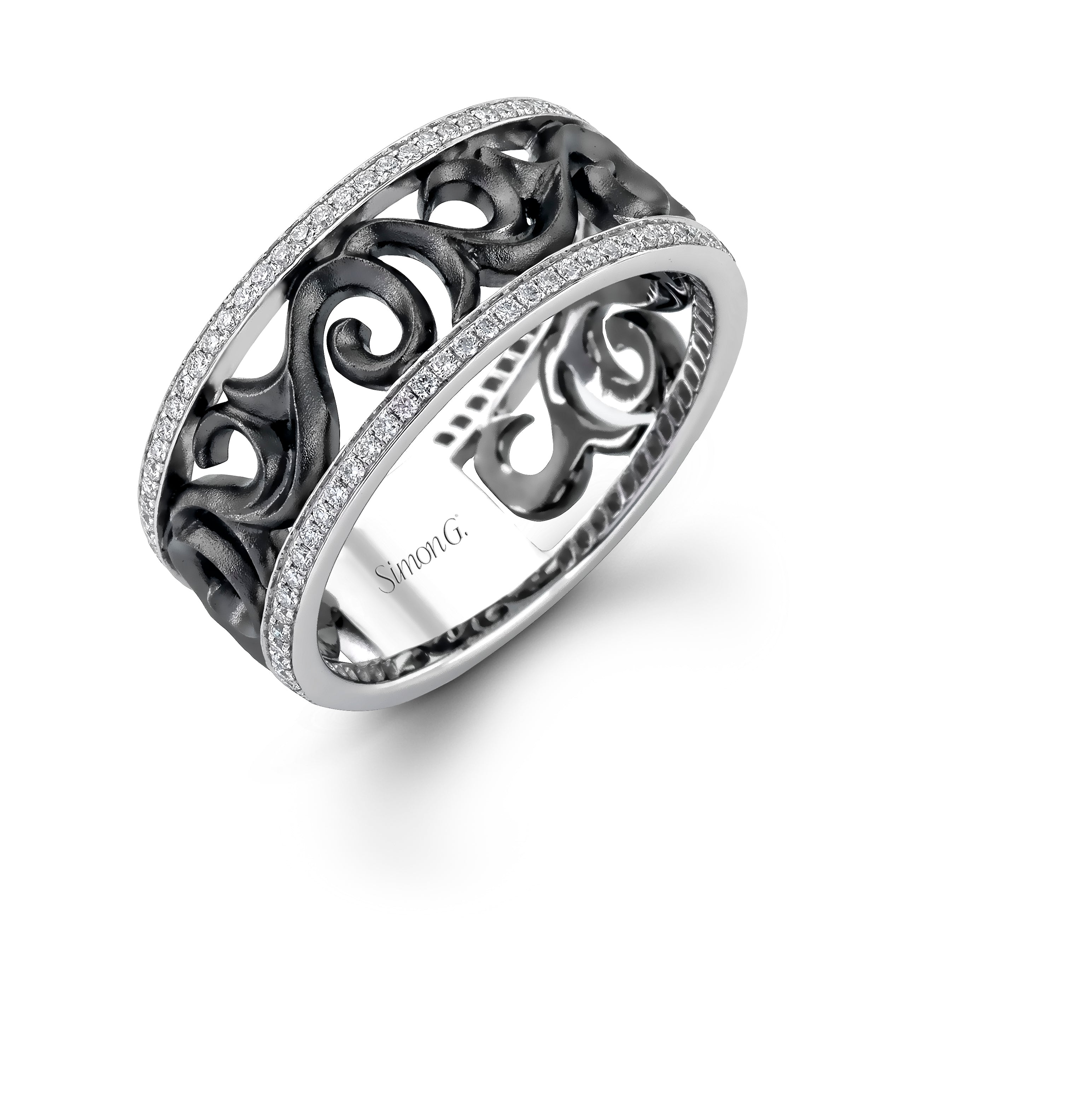 This statement men's band features an intricate, scrolling design set with white diamonds.