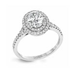 This beautiful, classic-style engagement ring features a double-halo design and shimmers with round white diamonds.