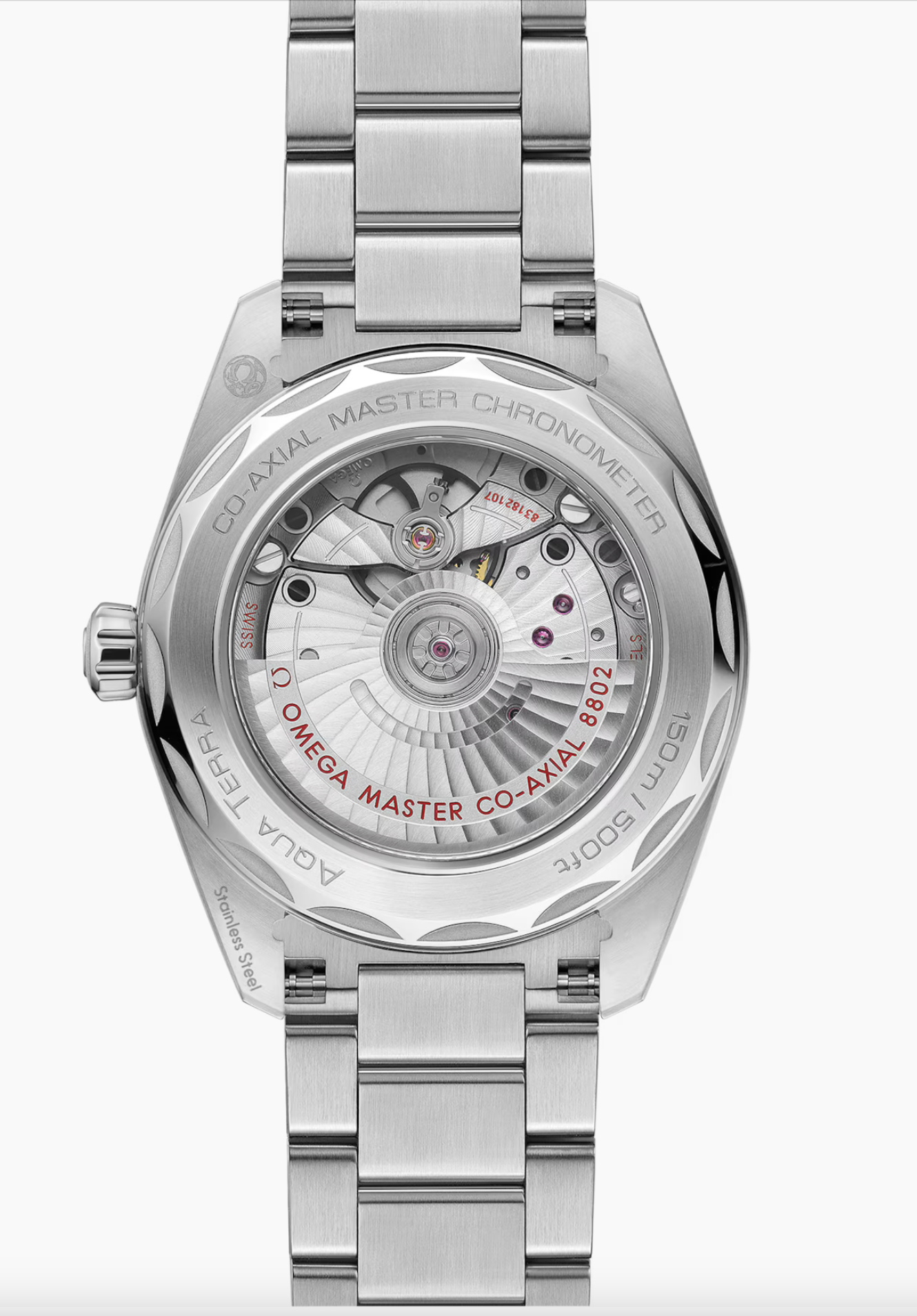 38 mm steel case, transparent back, domed scratch-resistant sapphire crystal with anti-reflective treatment on both sides, crystal linen dial, Calibre 8802 self-winding chronometer movement with small seconds and date. Water resistant to 150 metres (500 feet).