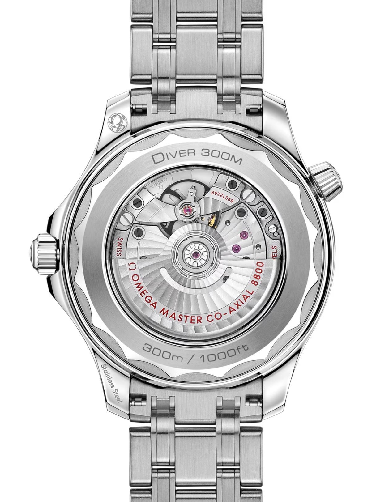 The watch has an 8800 automatic movement which is an in-house made caliber. A look at the Co-Axial escapement, you will notice that the caliber is immune to external effects caused by environmental magnetism. It also has a balance spring made of reliable silicon material. The watch also has an Omega’s Certification. The automatic movement of the watch operates at 4Hz and has a power reserve of 55 hours. In addition to that, there is a time and date window complication. The final result is a mechanical movement that is very resilient, reliable and accurate. The exact thing looked for by many people in a divers' watch.