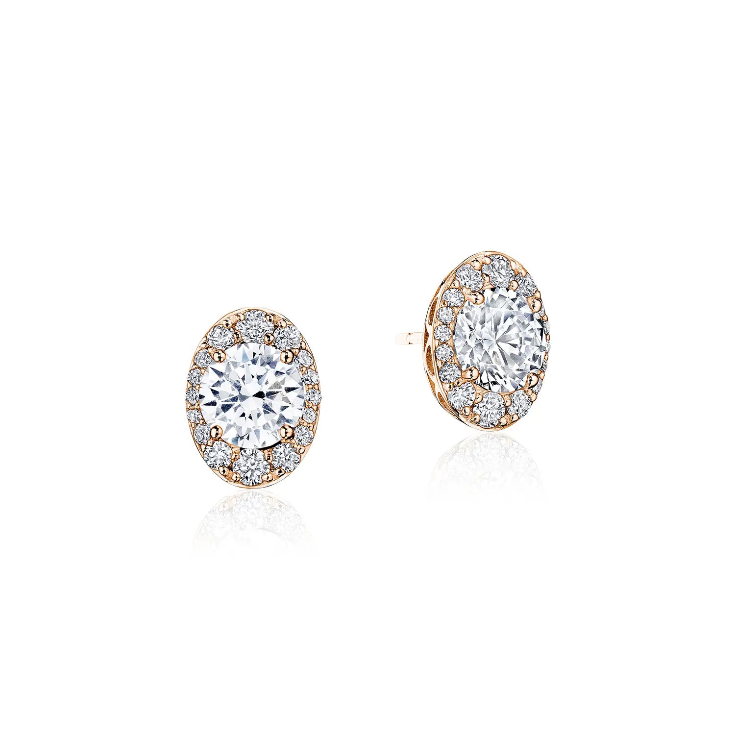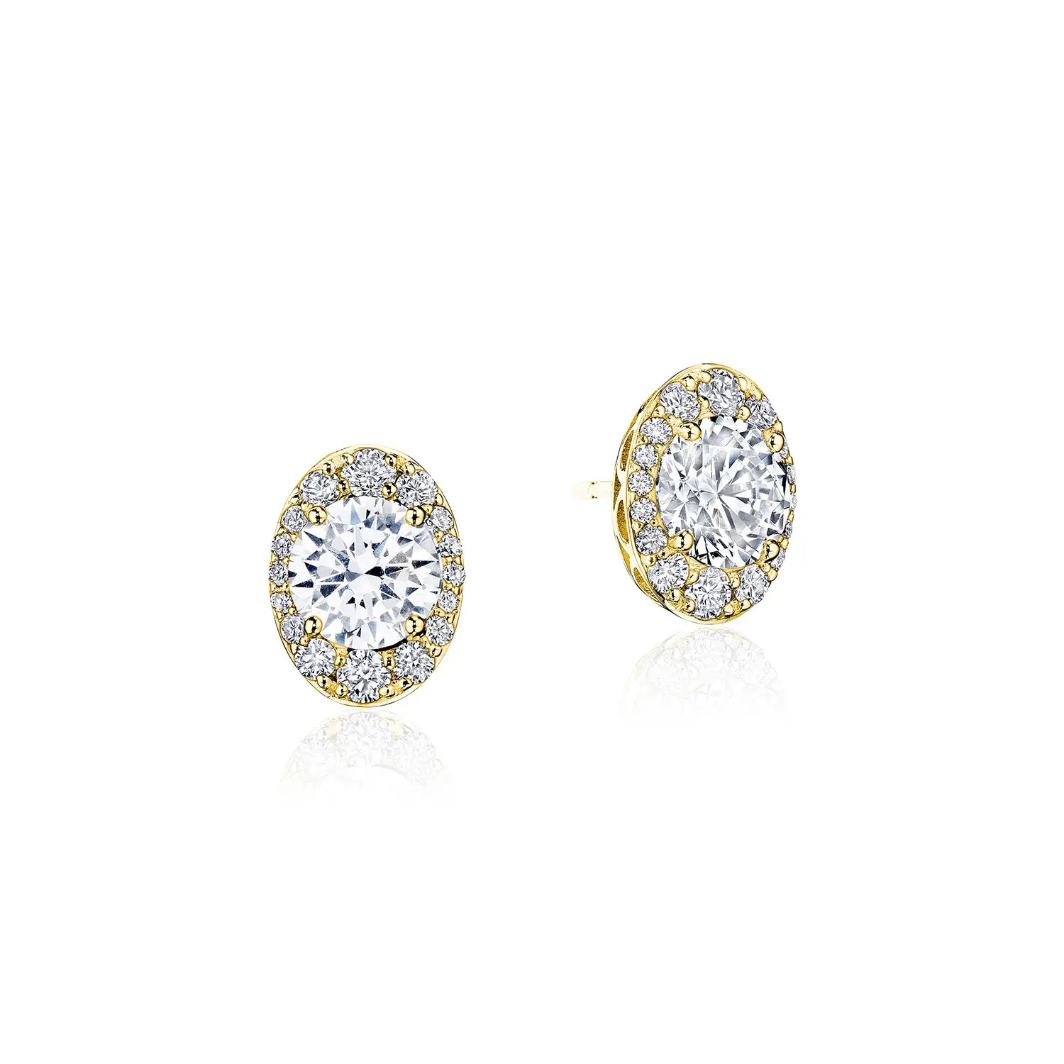 An oval bloom of spotlight diamonds transforms the center diamond into a shape totally its own, while adding clarifying depth and dimension. These striking earrings are classics with an exciting twist. Center diamond sold separately.