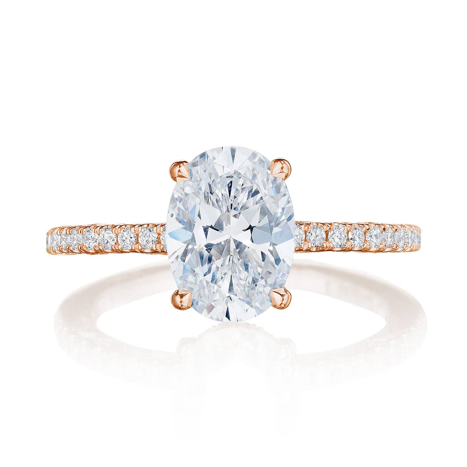 A French pavé ceiling adds dimensional light, while a hidden bloom and open air crown work illuminates the center stone. A complex and alluring lace-like Crescent Fabric gives stunning texture to the inner face profile.