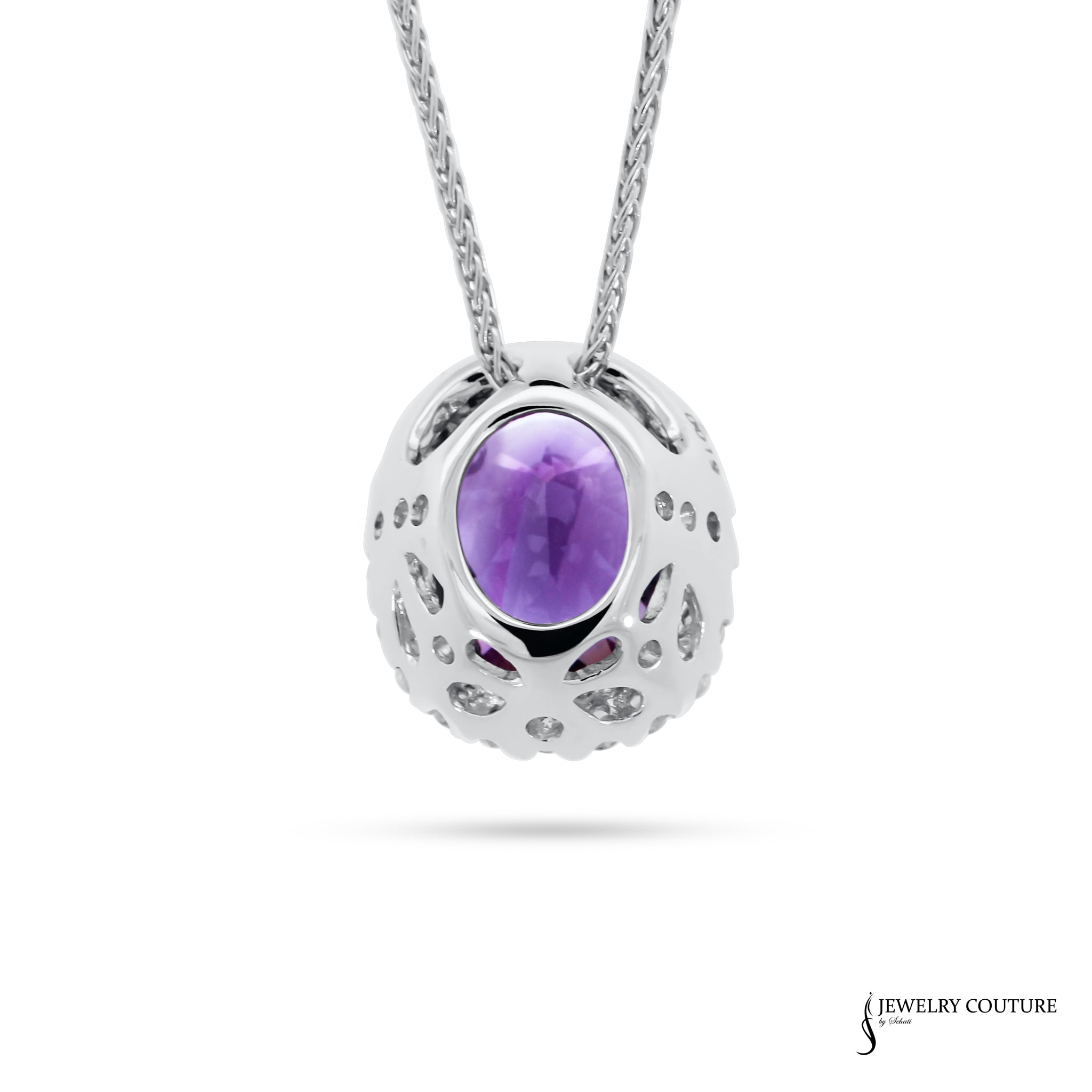 Add a touch of sophistication to your jewelry collection with this 14KT White Gold Charm, featuring a 1.53CT oval-cut amethyst surrounded by a 0.19CT diamond halo. The deep violet hue of the amethyst exudes elegance, while the shimmering diamonds enhance its brilliance.