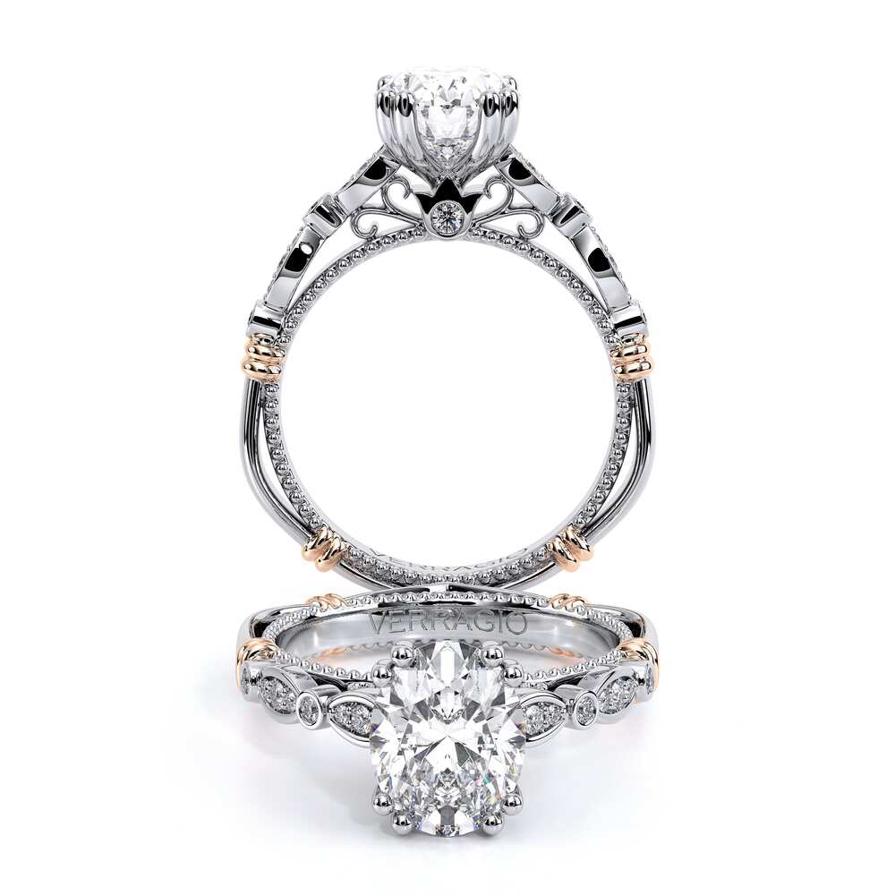 PARISIAN-100OV is a vintage inspired engagement ring that focuses on the unique bezel set round brilliant-cut diamonds on the straight band adorned handcrafted Parisian lace and rose gold Timeless wraps all dedicated to enhance the oval center.