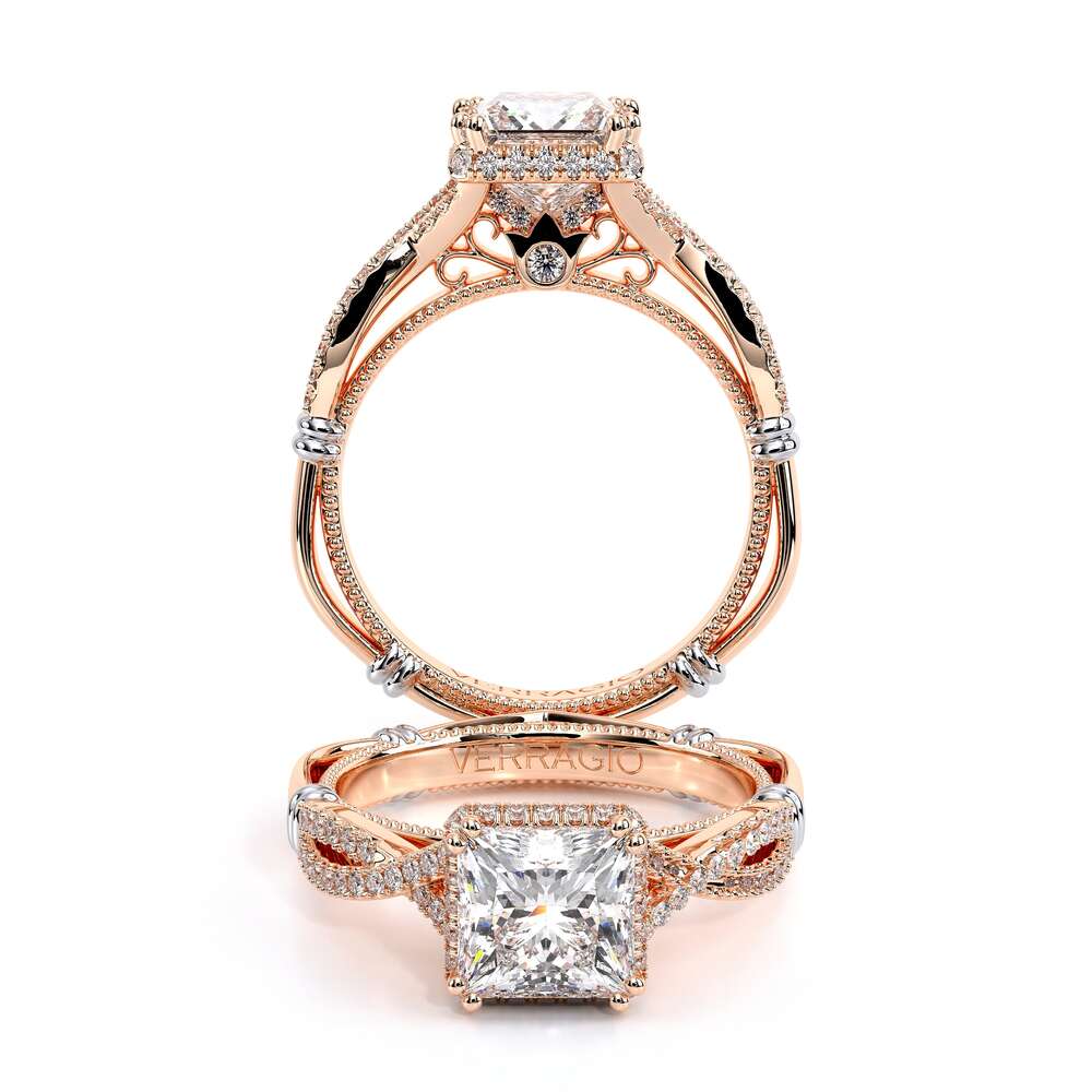 Parisian-105XP is a classic engagement ring that features pave set twisted diamond band showcasing our brand new Stardust princess halo. The details continue to flow with the addition of Parisian Lace our Verragio signature beading and lastly the rose gol