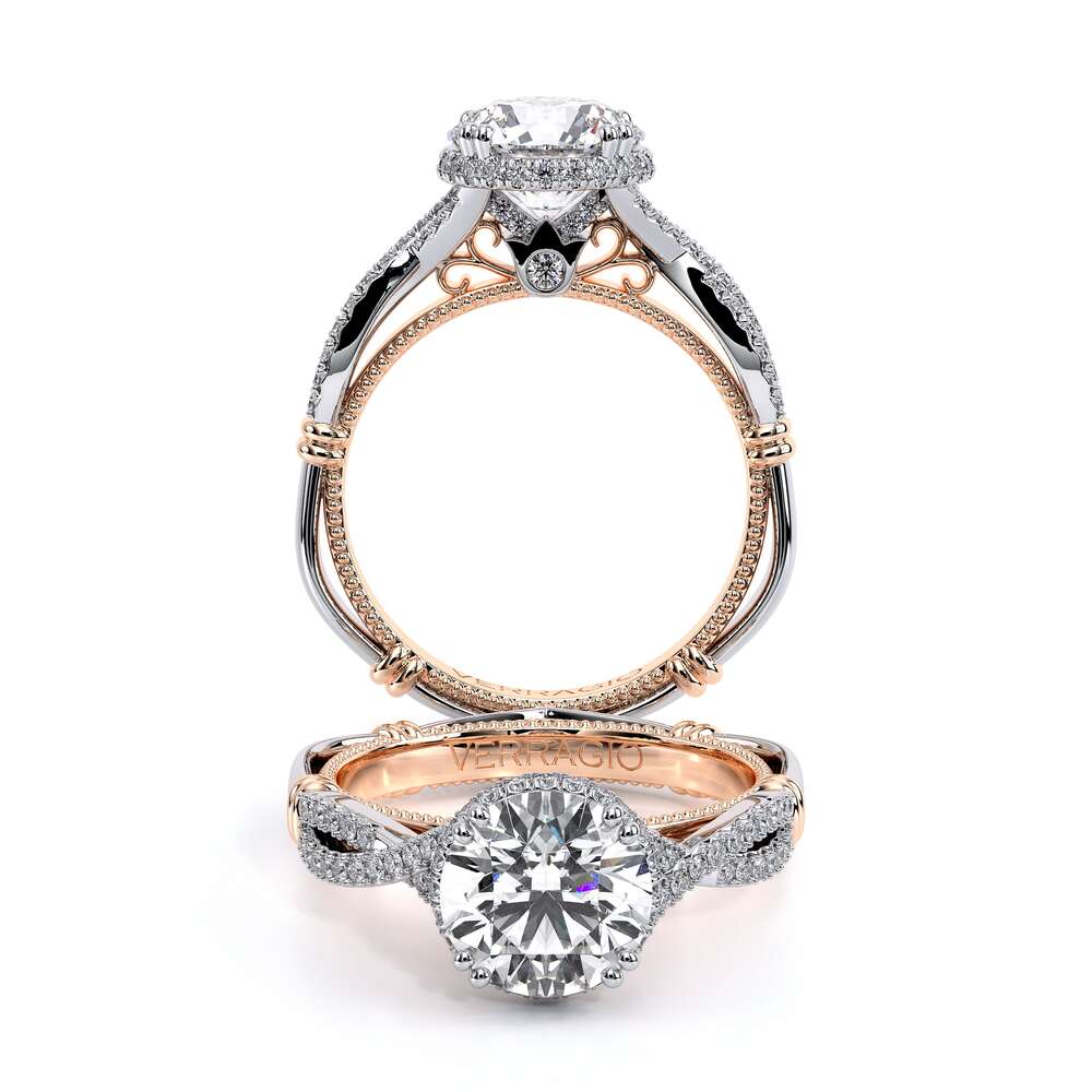 Parisian-105XR is a classic engagement ring that features pave set twisted diamond band showcasing our brand new Stardust round halo. The details continue to flow with the addition of Parisian Lace our Verragio signature beading and lastly the rose gold T