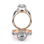Parisian-106R is a classic engagement ring that features pave set twisted diamond band with a brilliant round halo Parisian Lace detail our Verragio signature beading and lastly adorned with rose gold Timeless wraps.
