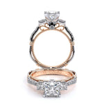 PARISIAN-124P is the beautifully designed three-stone engagement ring of your dreams. Featuring the traditional look of the princess cut side stones Timeless wraps in rose gold and our elegant Verragio signature beading.