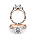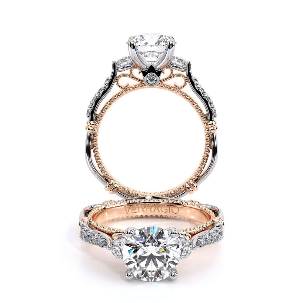 PARISIAN-124R is the beautifully designed three-stone engagement ring of your dreams. Featuring the traditional look of the round brilliant side stones Timeless wraps in rose gold and our elegant Verragio signature beading.