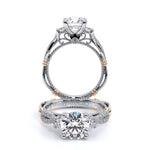 Parisian-129R is an intricately woven diamond band three-stone engagement ring that highlights the traditional round brilliant side stones. It is accompanied by our signature Verragio beading and the Timeless wraps that accentuates the round center diamon