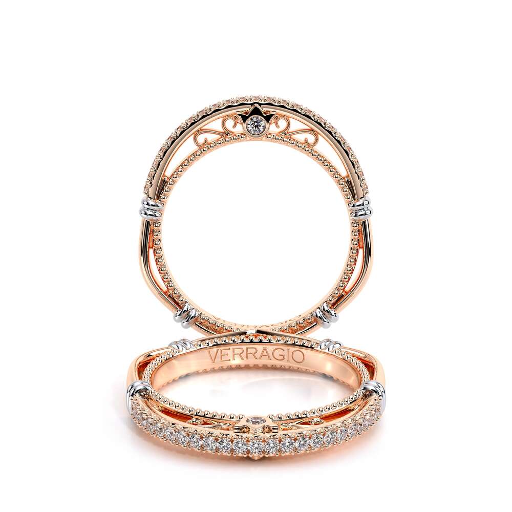 Parisian-129WSB straight wedding band featuring pave set diamonds and mirrors the handcrafted rose gold Parisian lace and Timeless wraps details of the engagement ring to create the perfectly matching set. **Note: +$400 for Lace Beading or Both in a dif