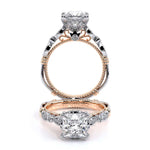 PARISIAN-151R engagement ring carries the vintage scalloped design while adding a beautiful handcrafted diamond tiara to enhance the Princess center diamond. Featuring our rose gold Timeless wraps Parisian Lace and Verragio' s signature beading- this ring