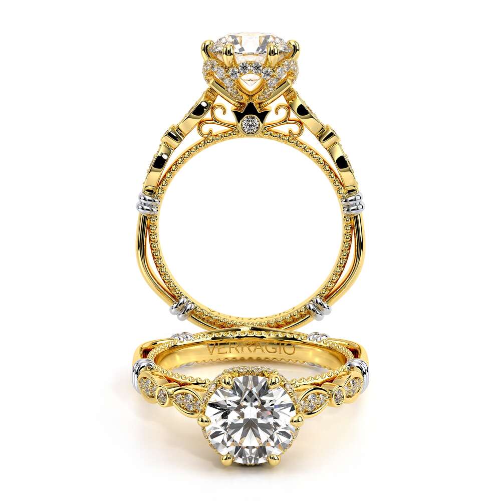 PARISIAN-151R engagement ring carries the vintage scalloped design while adding a beautiful handcrafted diamond tiara to enhance the round center diamond. Featuring our rose gold Timeless wraps Parisian Lace and Verragio' s signature beading- this ring is