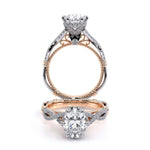 Parisian-153OV is a uniquely designed engagement ring that showcases Verragio' s diamond encrusted tiara that enhances a princess diamond center. The details continue through with the addition of the Timeless wraps Parisian lace and Verragio signature b