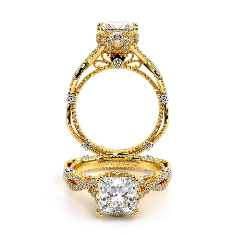 Parisian-153P is a uniquely designed engagement ring that showcases Verragio' s diamond encrusted tiara that enhances a princess diamond center. The details continue through with the addition of the Timeless wraps Parisian lace and Verragio signature be