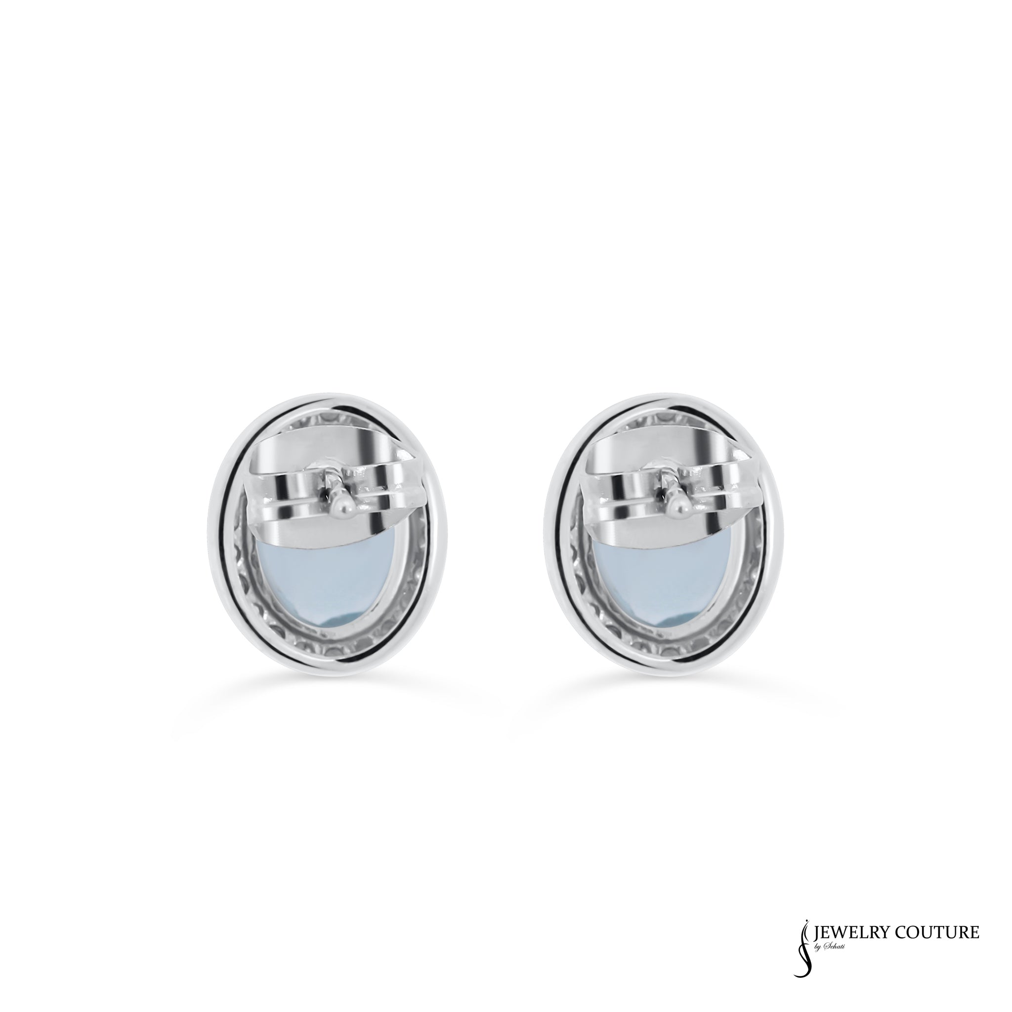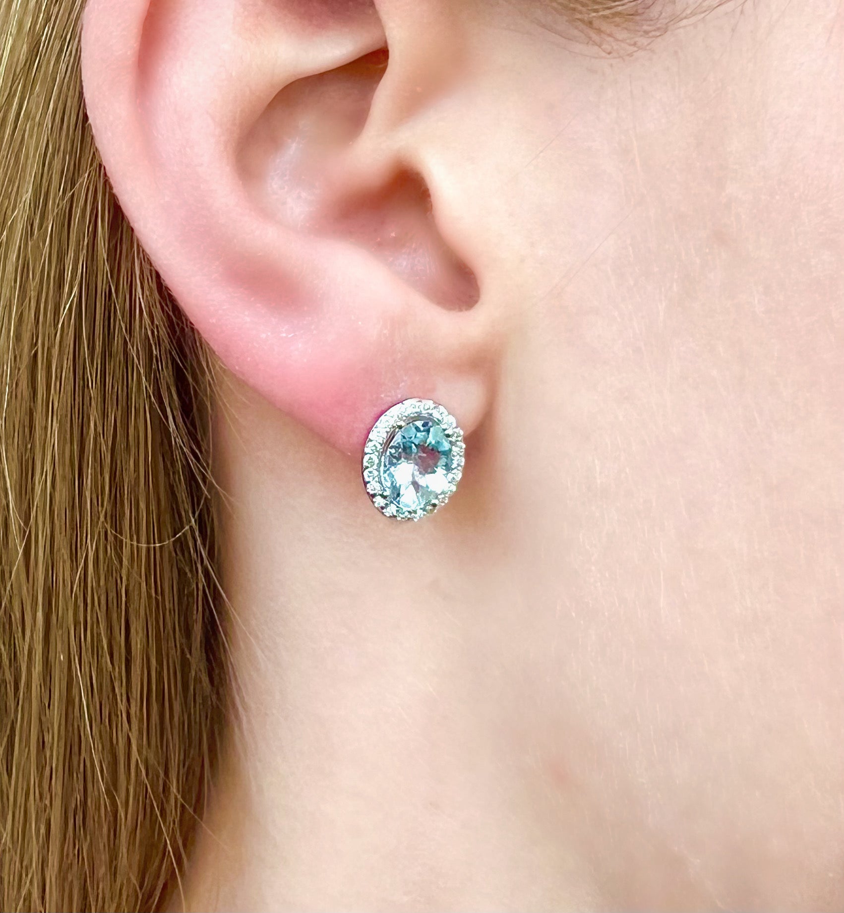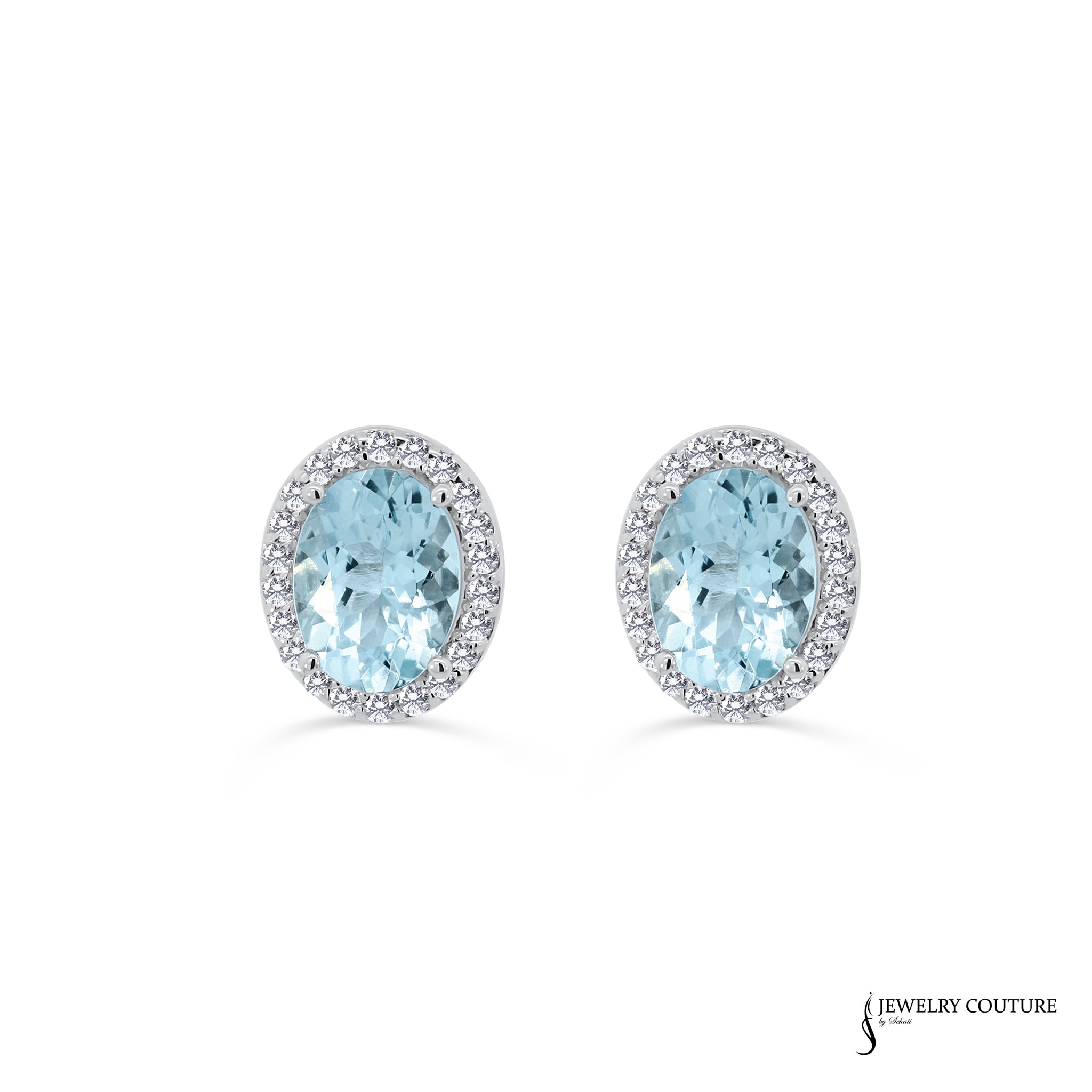Passiflora - 14KT White Gold Oval Aquamarine and Diamond Halo Stud Earrings
