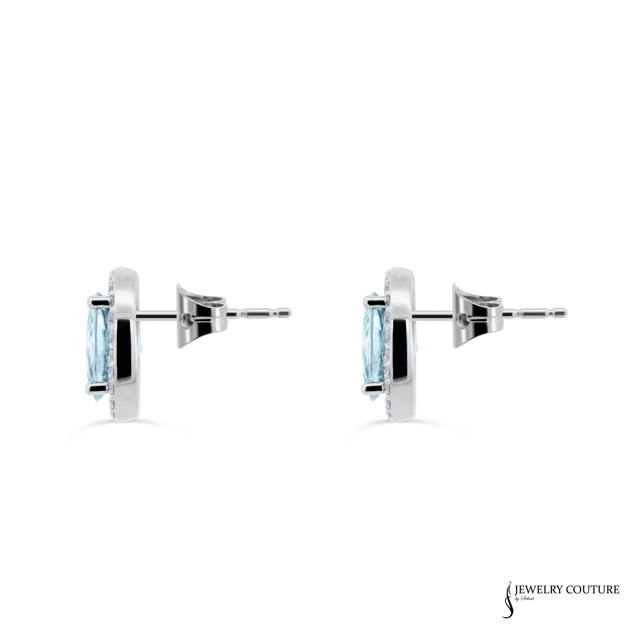 Elevate your elegance with these stunning 14KT White Gold Halo Stud Earrings, featuring 2.20CT total weight of oval-cut aquamarine gemstones that radiate a serene, icy blue. Surrounded by a shimmering halo of 0.28CT total weight diamonds, these earrings offer the perfect blend of brilliance and sophistication. The classic halo design enhances the aquamarines' natural sparkle, making them a timeless addition to any jewelry collection.