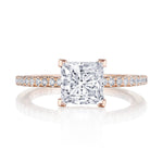 A French pavé ceiling adds dimensional light, while a hidden bloom and open air crown work illuminates the center stone. A complex and alluring lace-like Crescent Fabric gives stunning texture to the inner face profile.