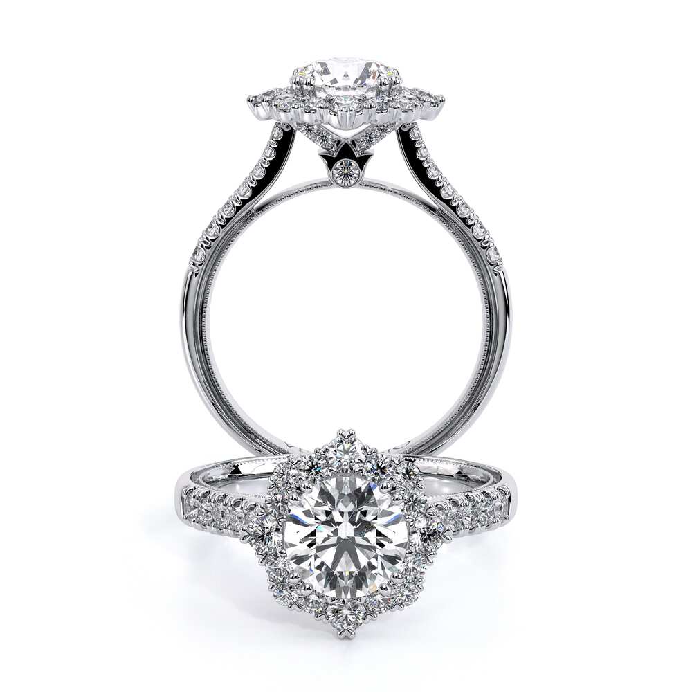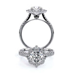 Renaissance-982HR pave engagement ring radiates elegant styling with our starburst halo. Diamond prongs add sparkle to the profile in this unique handcrafted engagement ring.