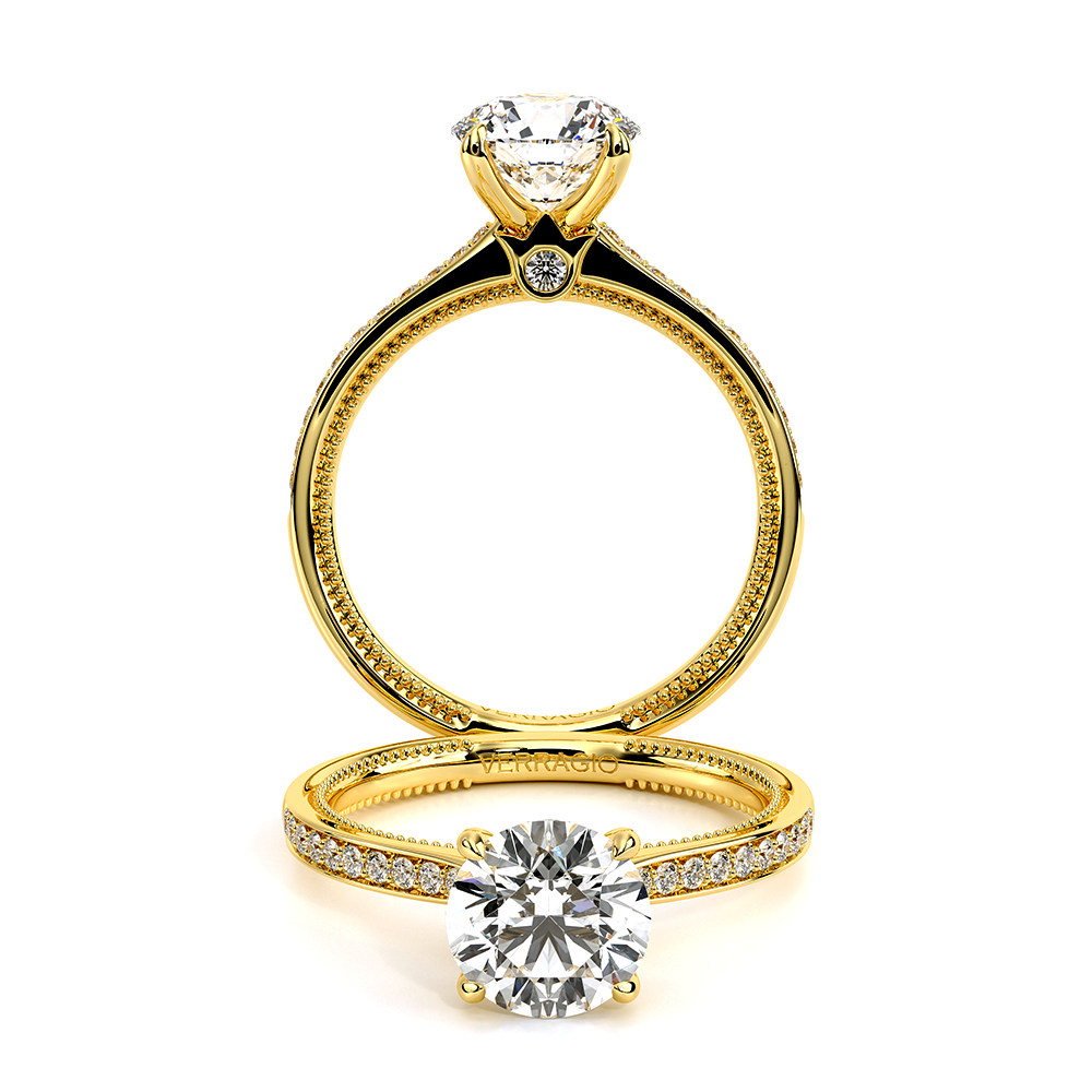 Renaissance-SLD301-R is a timeless engagement ring created for your perfect Round shaped center stone. The diamond band is set to maximize the sparkle and brilliance of your center stone. This setting features an elegant and refined profile with Verragio'