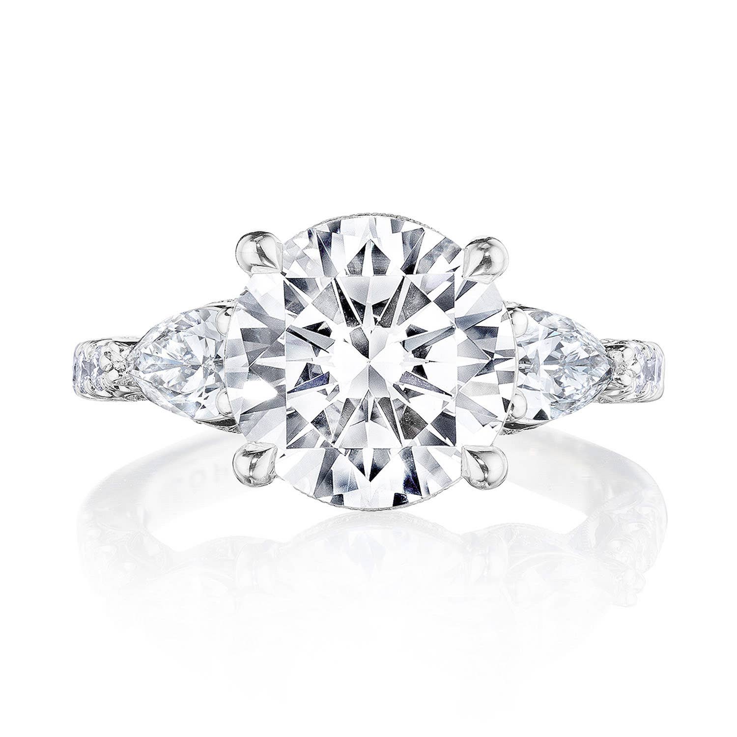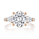 This three stone ring features distinctive pear side stones that sit atop a lace-like crown and foundation of complex, milgrain-edged Dantela Crescent Fabric. Meticulous, hand-set French pavé leads up the ceiling for eye-catching brilliance.