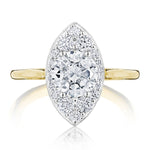Round-brilliant diamonds around the center stone create a marquise-shape crown, which is set into an intricate Cathedral foundation. The high-polish band is lightly embellished with diamonds on the ceiling.