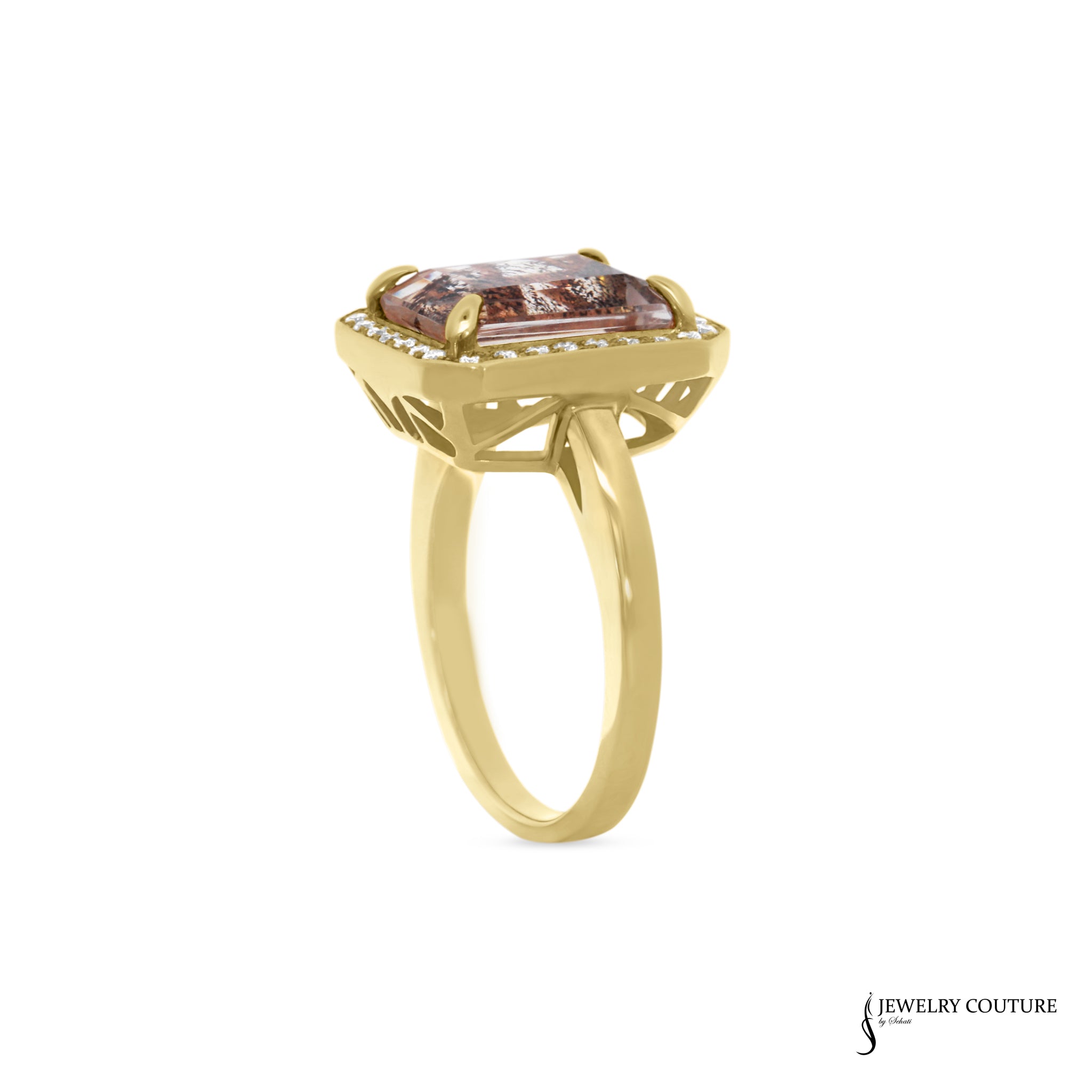 Crafted from 14KT Yellow Gold and featuring a 4.54CT Rutilated Quartz center stone, this ring is sure to turn heads. The delicate 0.18CT diamond halo adds a touch of sparkle, making it the perfect accessory for any occasion.