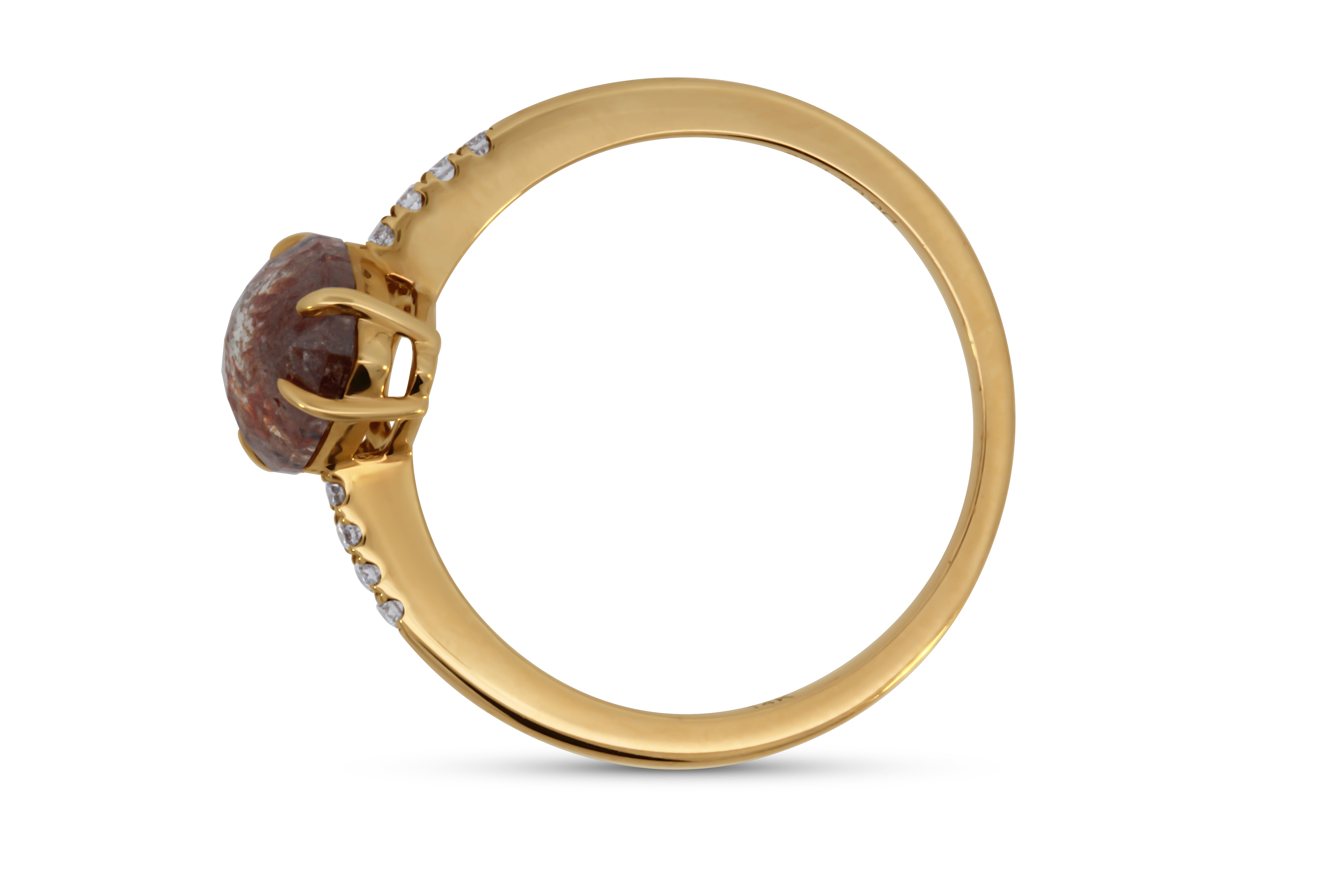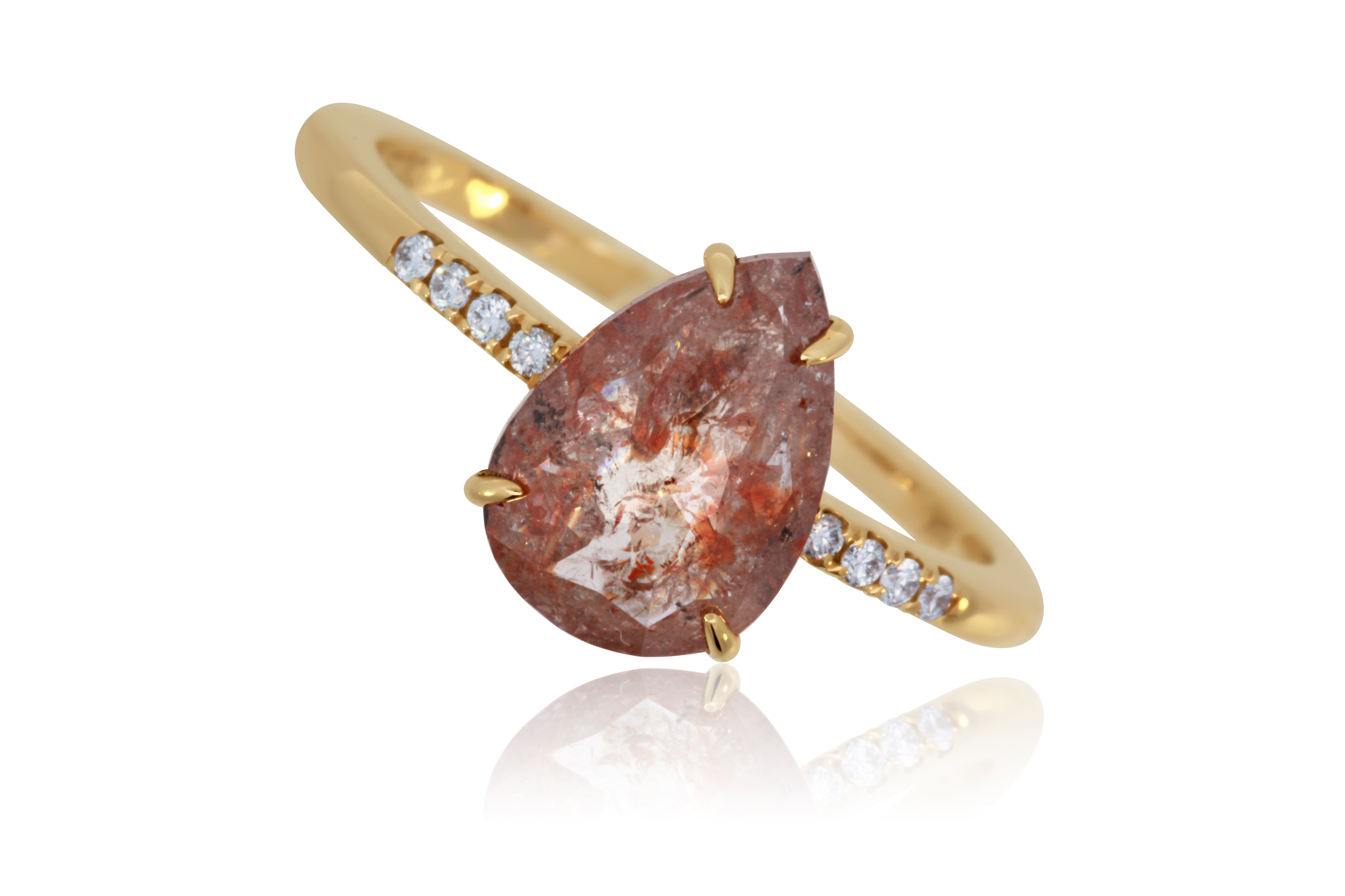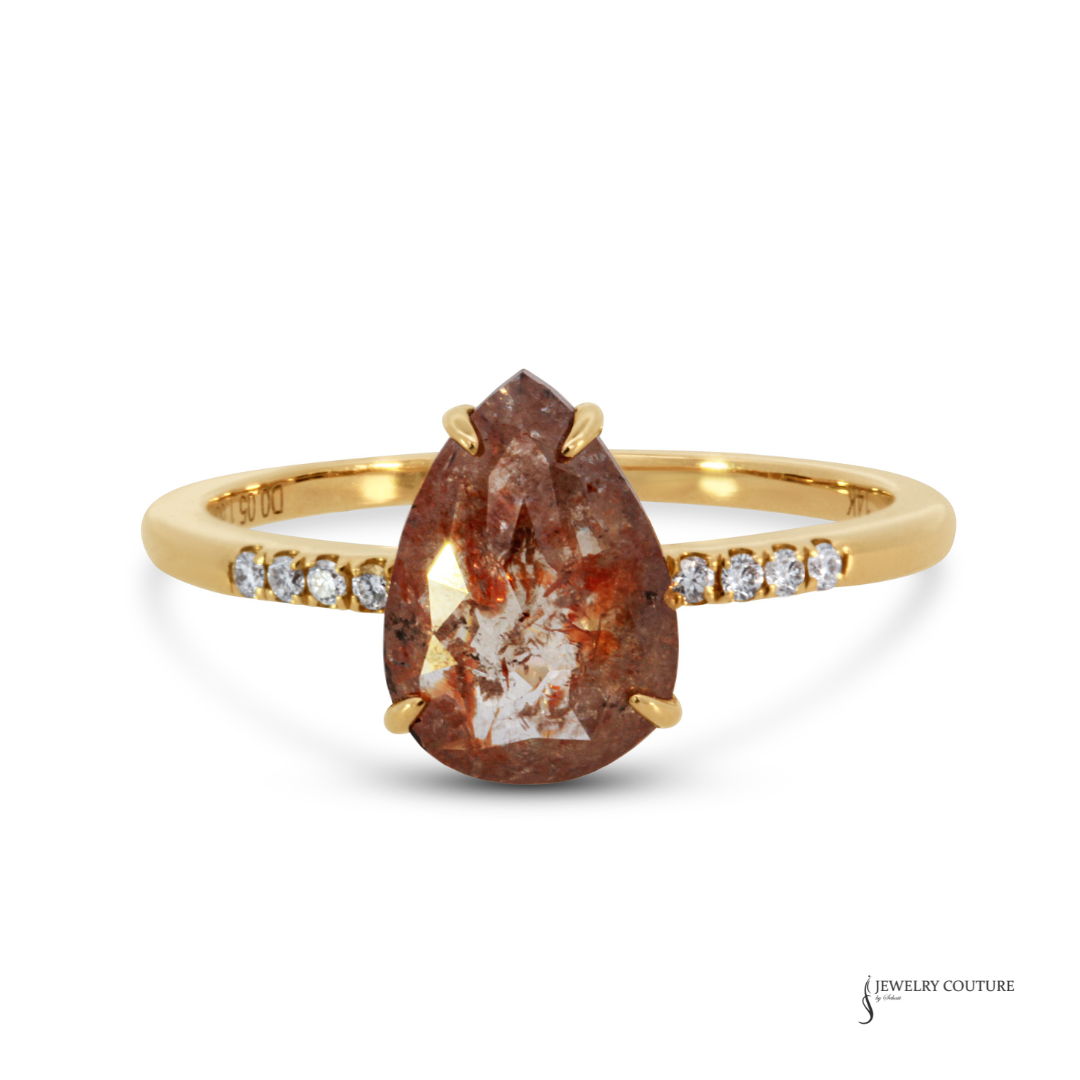 14K Yellow Gold Salt and Pepper Diamond Ring featuring a striking 1.66 carat pear shape orange and white diamond at its center. The warm, earthy tones of the salt and pepper diamond are enhanced by 0.50 carats of sparkling white diamond side stones, set along a sleek yellow gold band for the perfect balance of boldness and elegance.