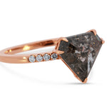 Make a bold, modern statement with our 14KT Rose Gold Salt & Pepper Diamond Ring, featuring a stunning 1.87ct pentagon-cut center diamond. Each salt and pepper diamond is one of a kind, filled with captivating natural inclusions that make your ring truly unique. Set in a warm rose gold band, this geometric centerpiece is securely held by six elegant prongs.