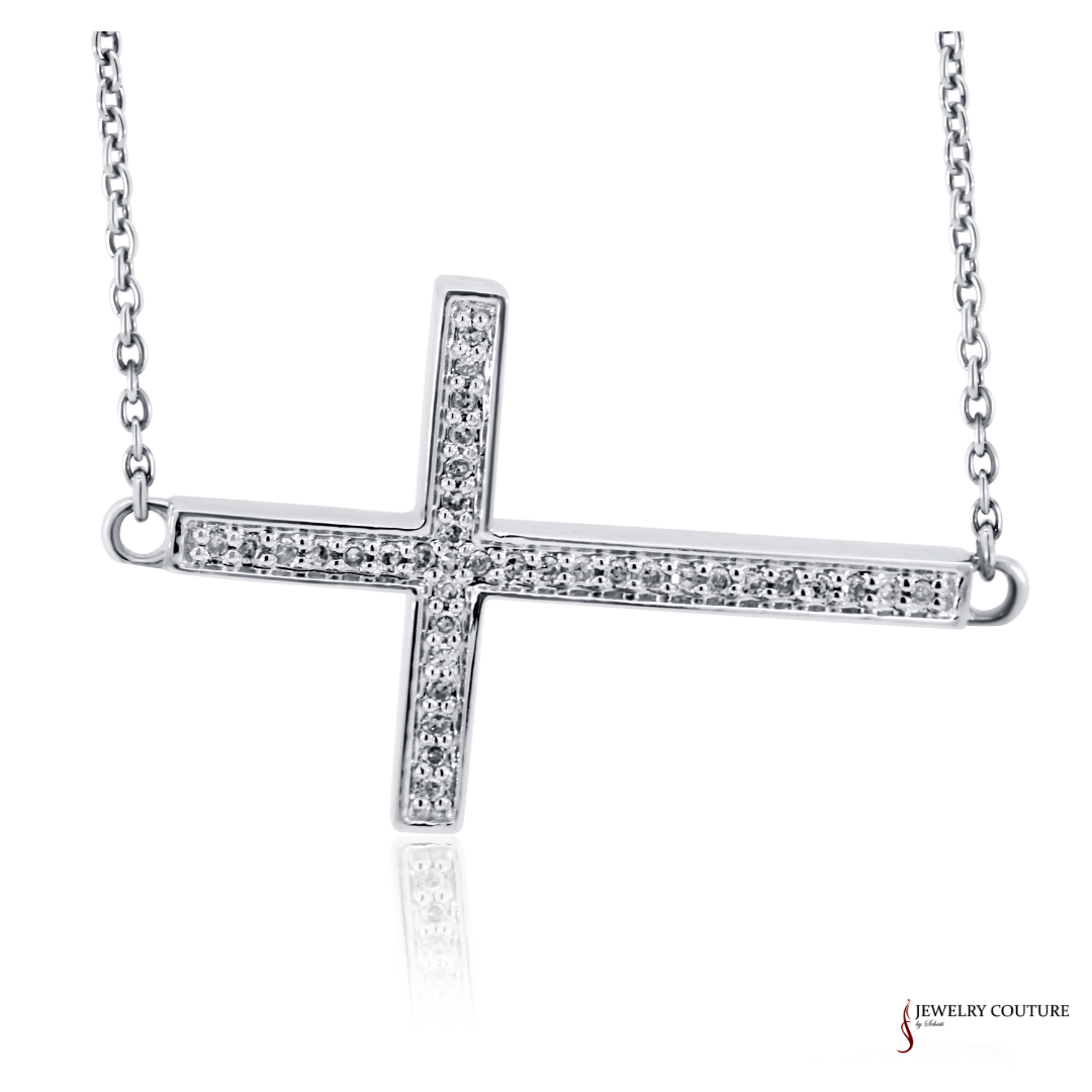 Silver Cross Sideways Necklace with Round Diamonds – 0.11 TDW