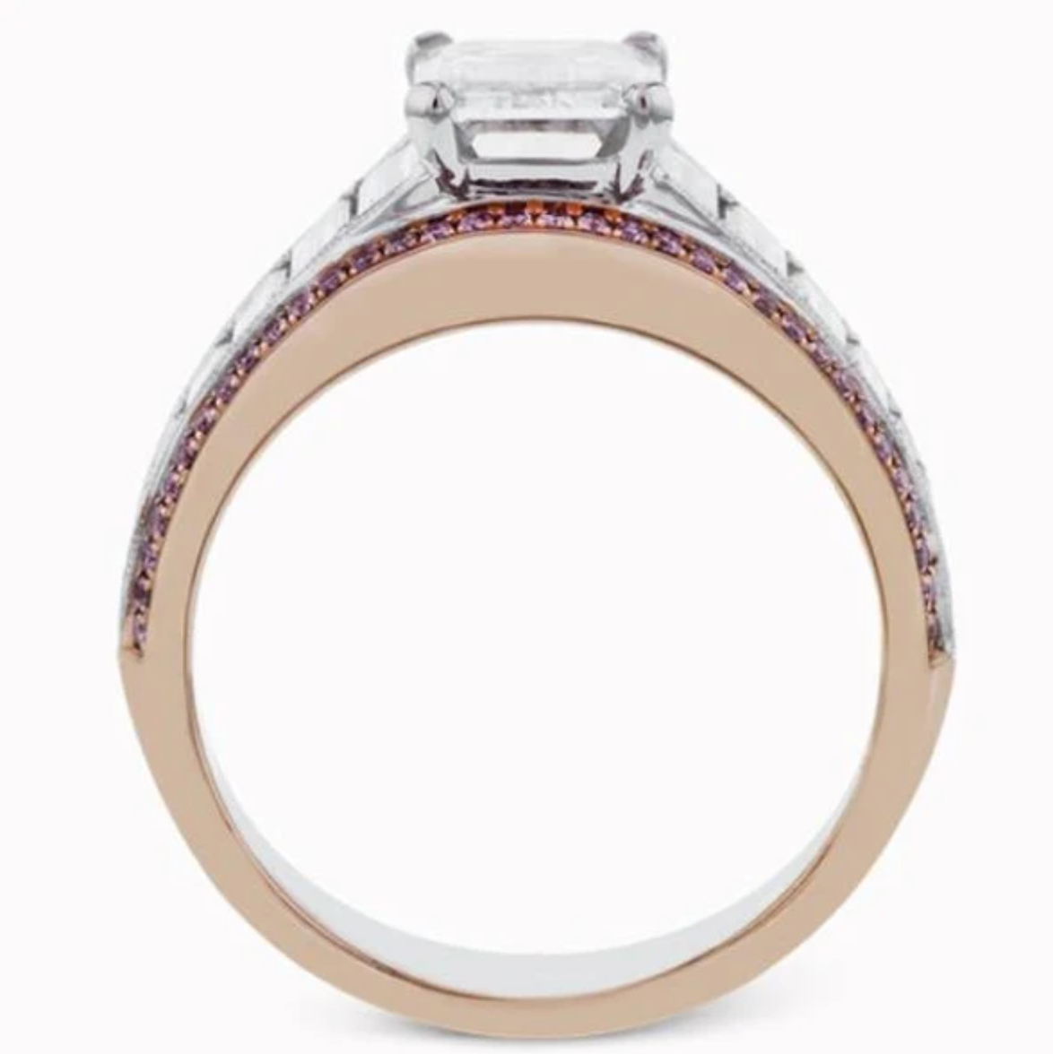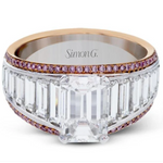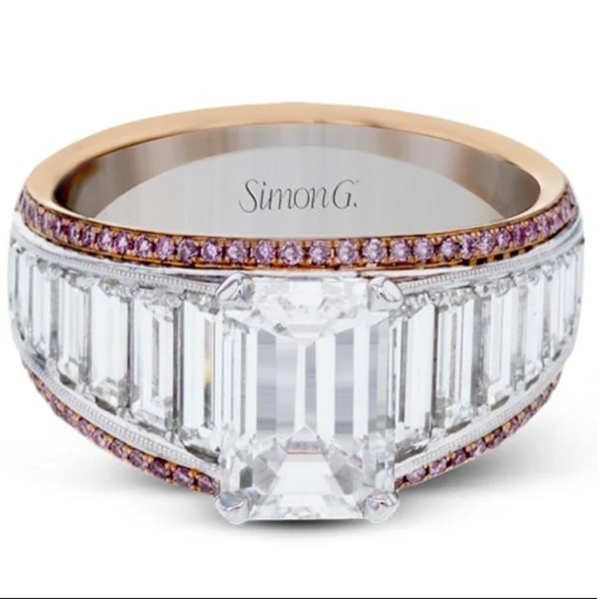 Simon G. Large Center Emerald Cut Diamond Baguette Engagement Ring Featuring 2.12 Carats Baguette Diamonds and 0.20 Carats Round Cut Pink Diamonds