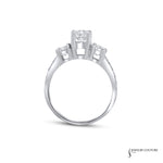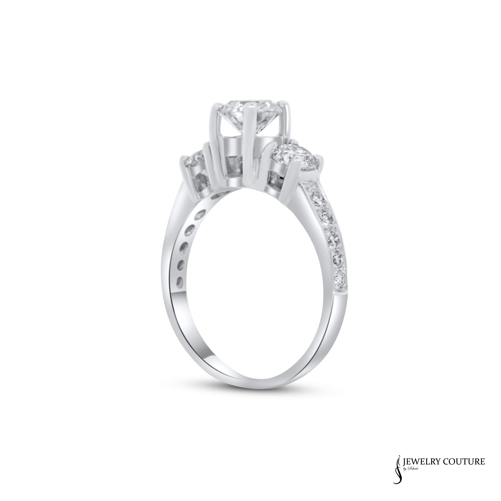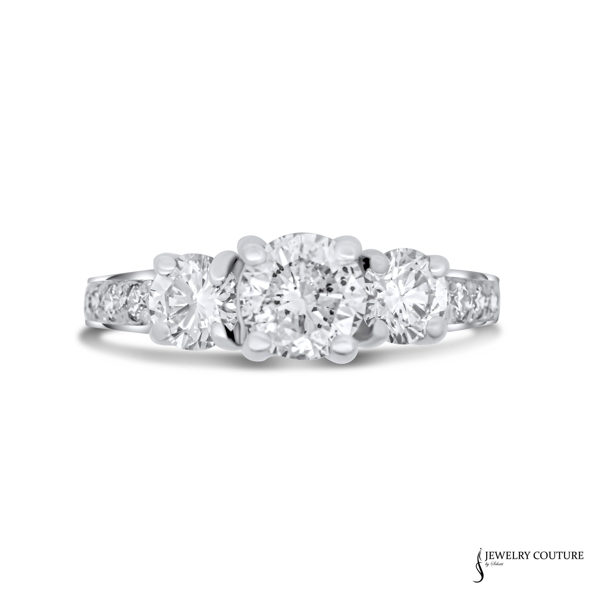 This sparkling ring features a round center stone at 0.58CT and two side diamonds at 0.70CT Total Weight Diamonds, all set in a 14KT White Gold.
