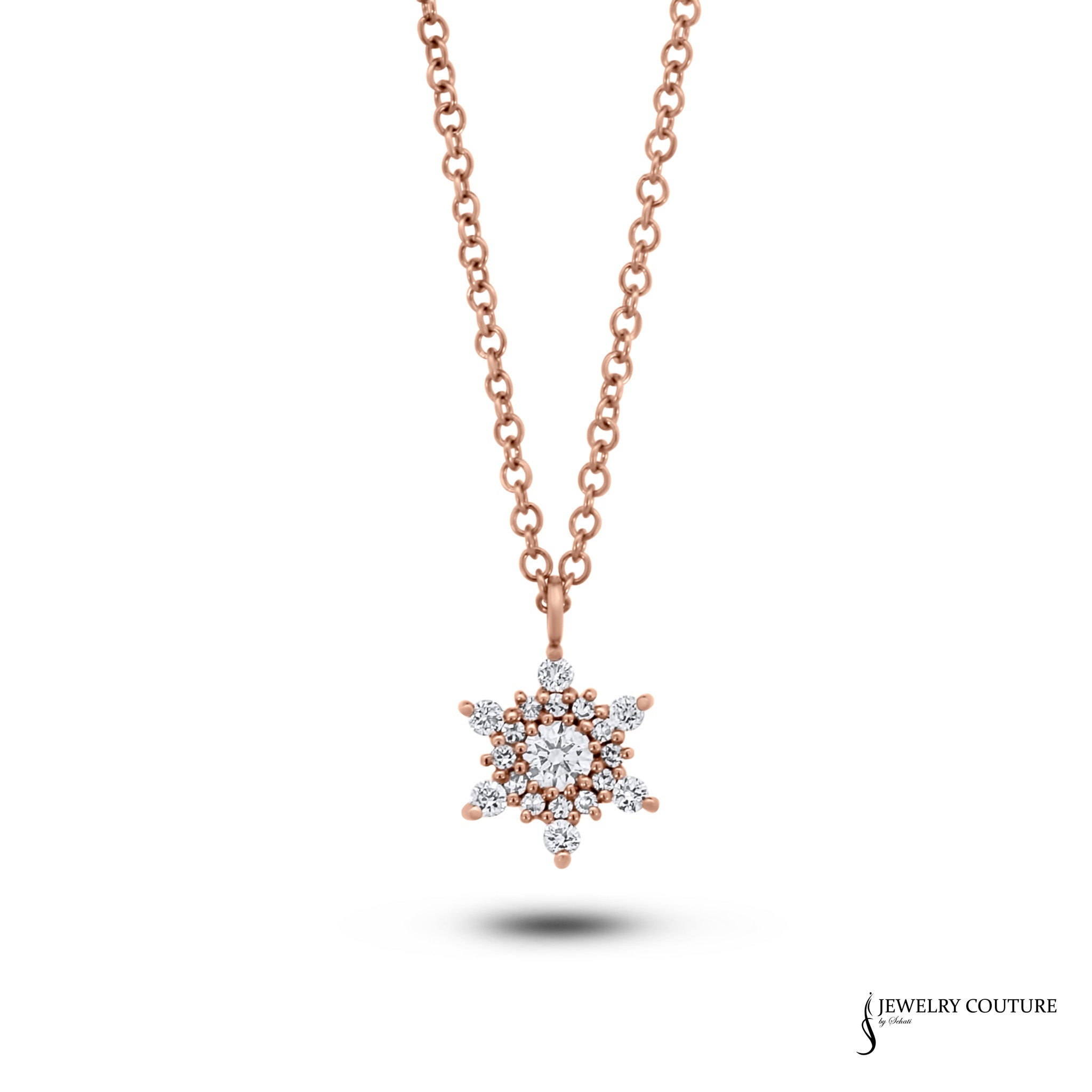 Be one of a kind just like a snowflake. This 14KT Rose gold and 0.14 CT total weight Diamond necklace is the perfect fit for the one of a kind person in your life.