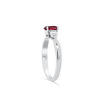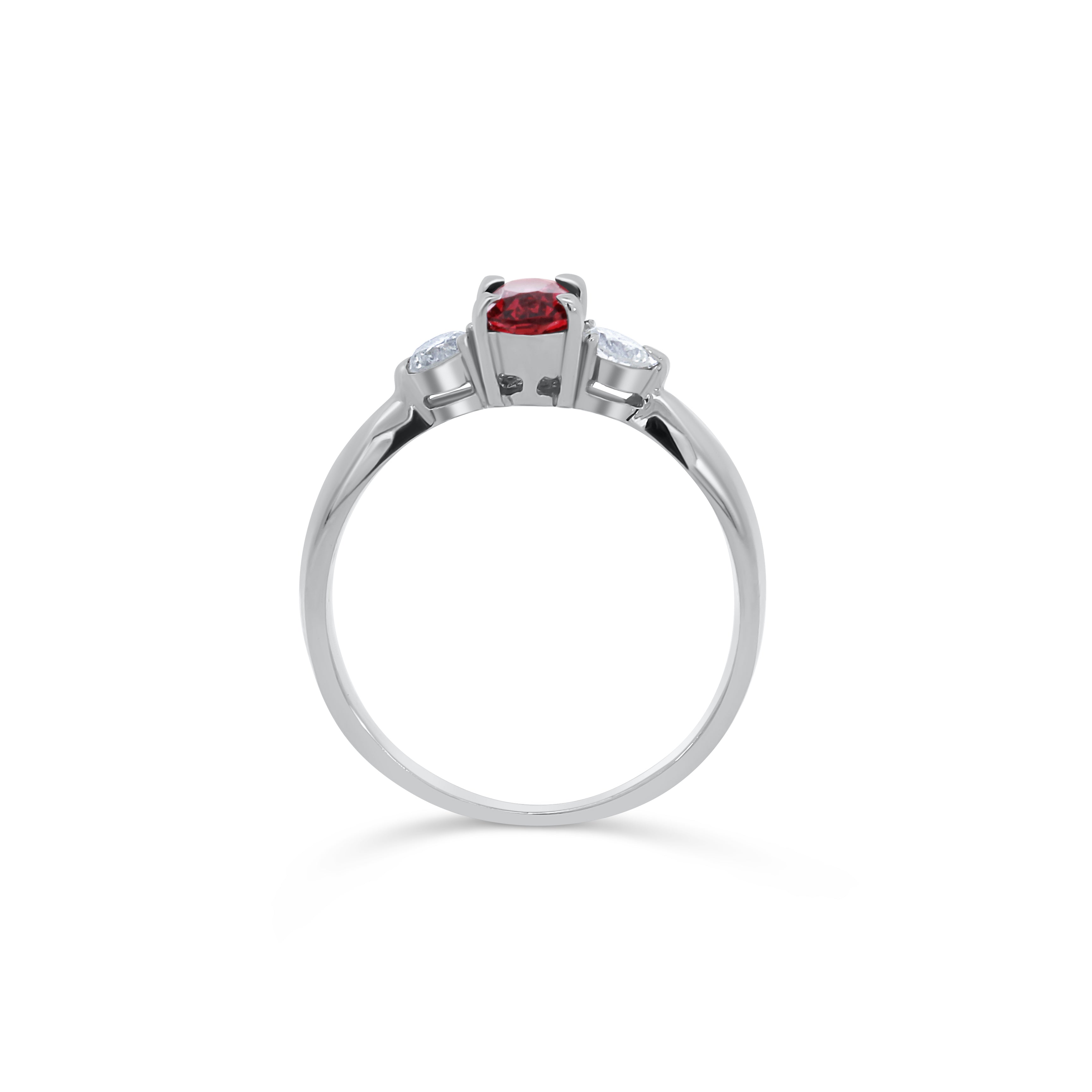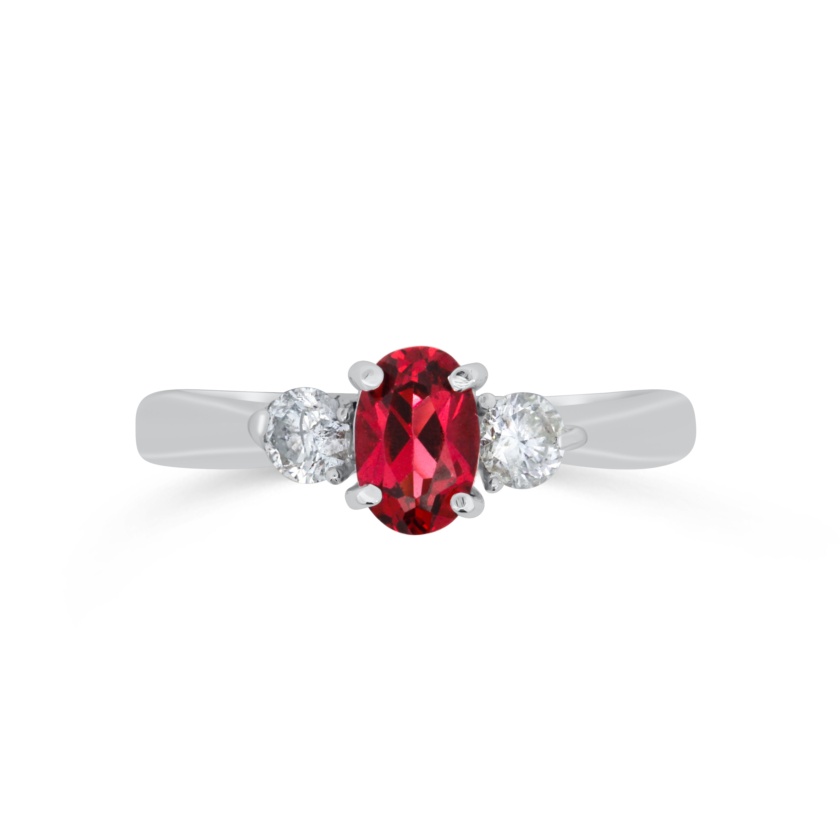 This stunning 14KT White Gold ring showcases a 3 stone design featuring a 0.62CT oval Rhodalite Garnet and 0.31CT TWD Diamonds. Perfect for adding a touch of elegance and color to any outfit.