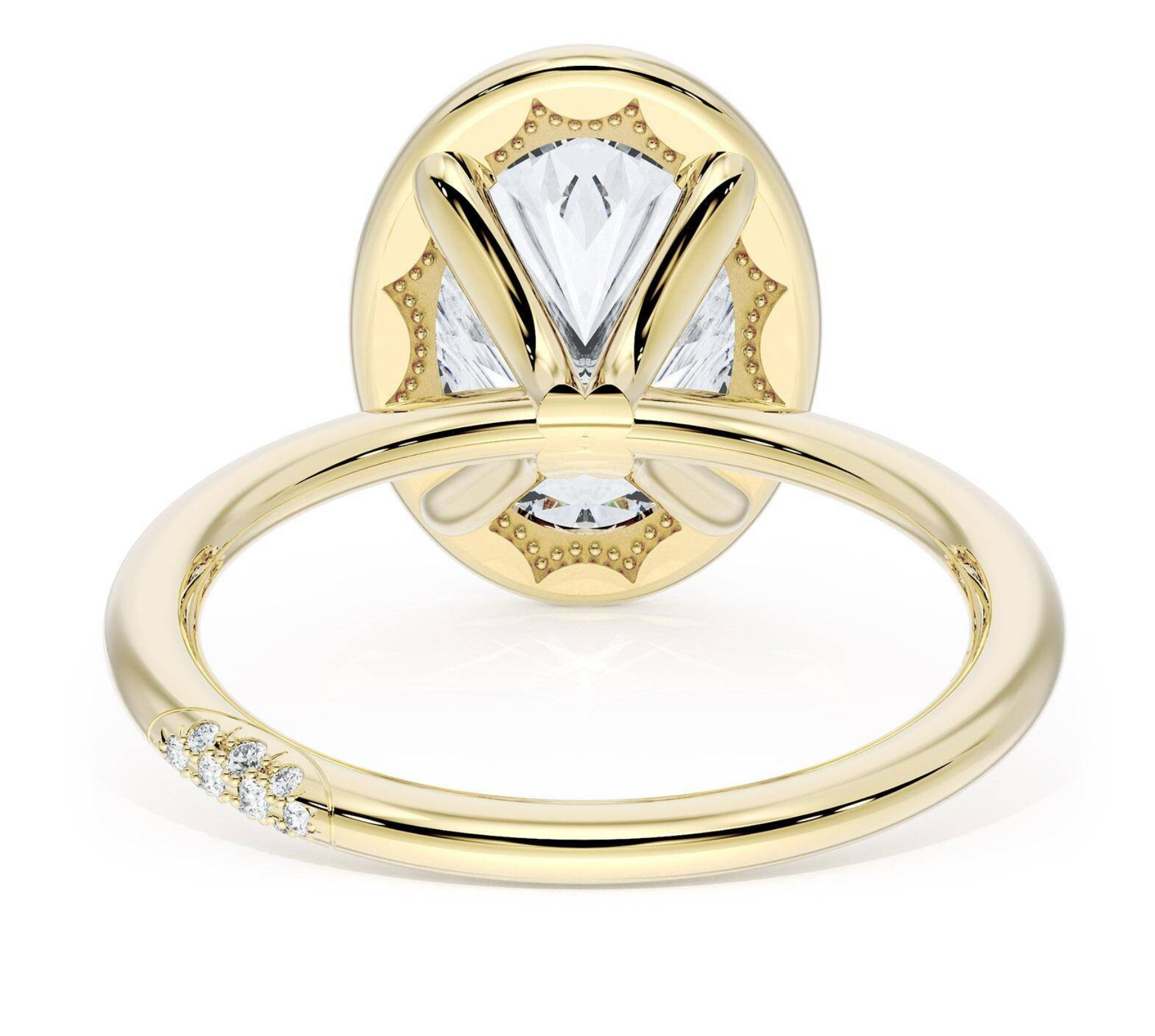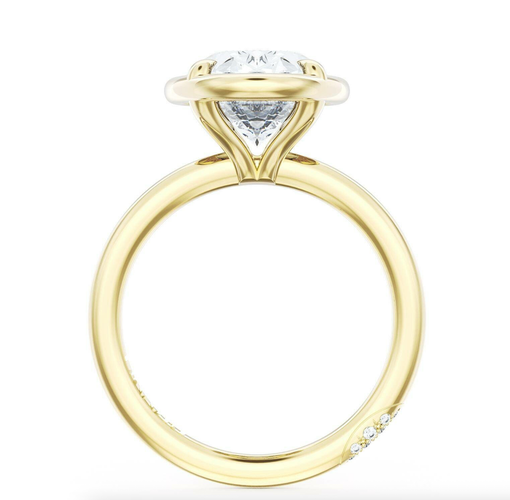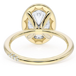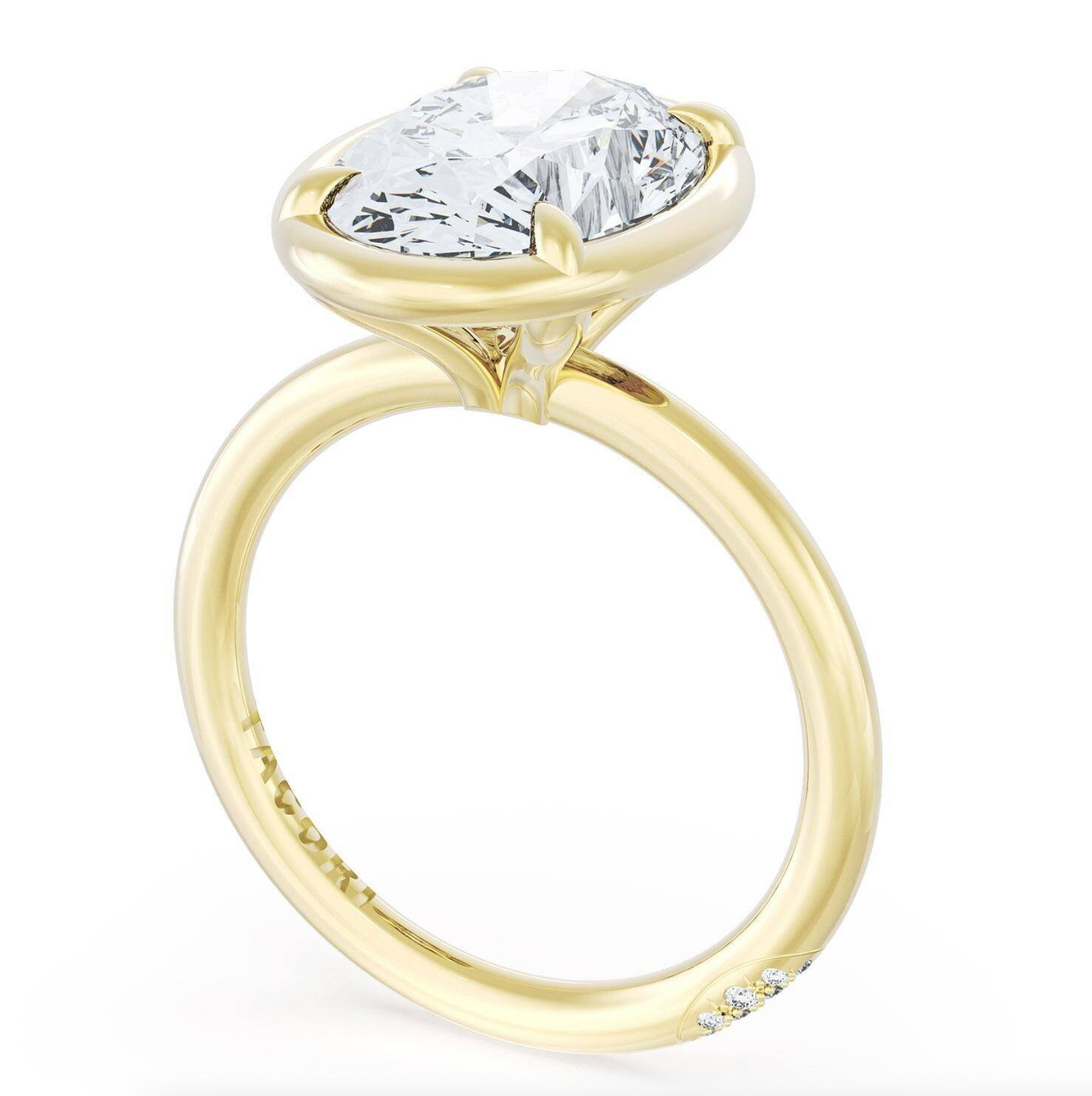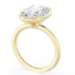 A Oval solitaire is elevated by a modern high polish crown, and set into a 18kt Yellow Gold foundation. TACORI Crescents add hidden detail to the underside of the crown.