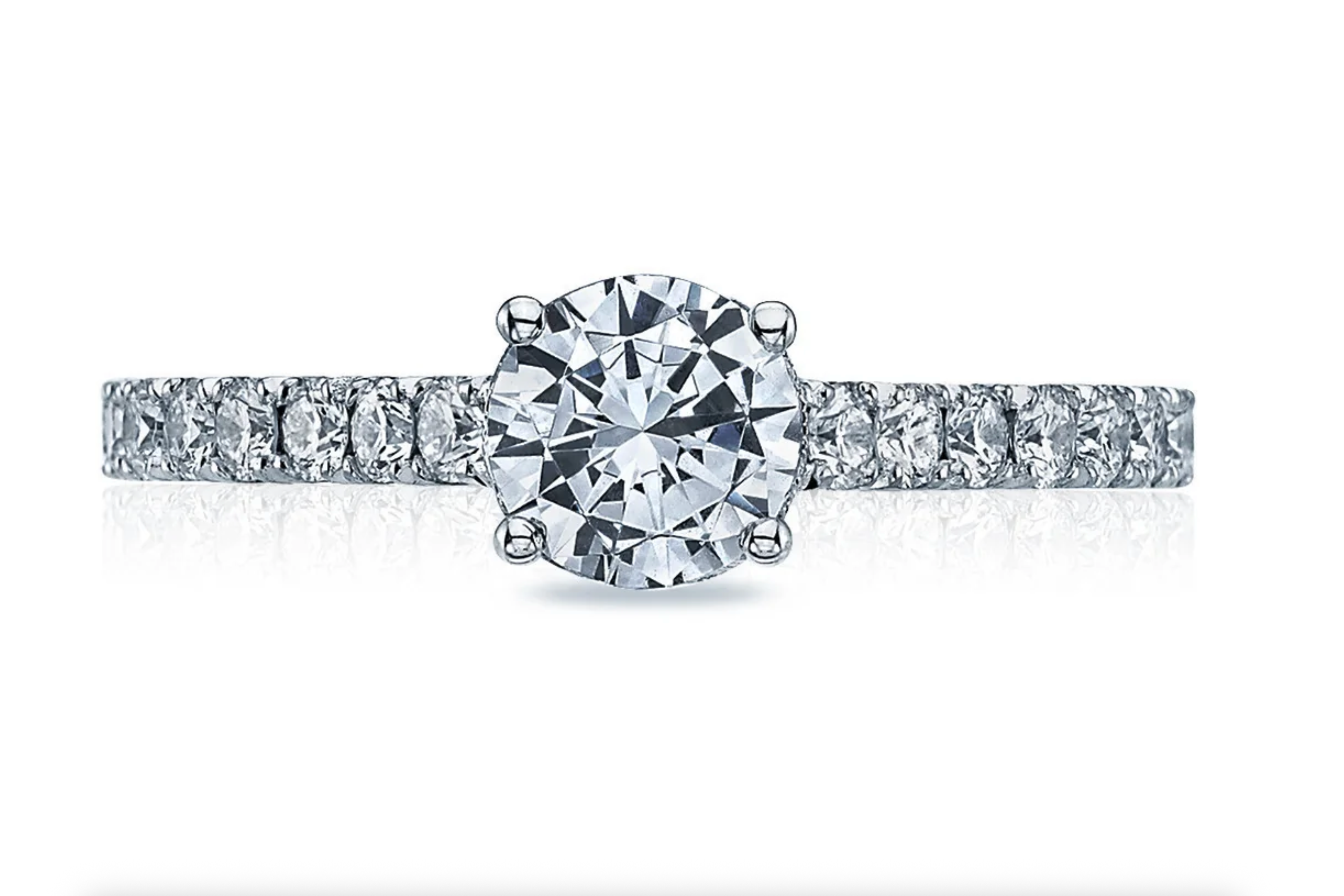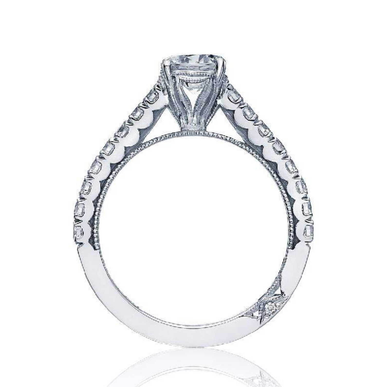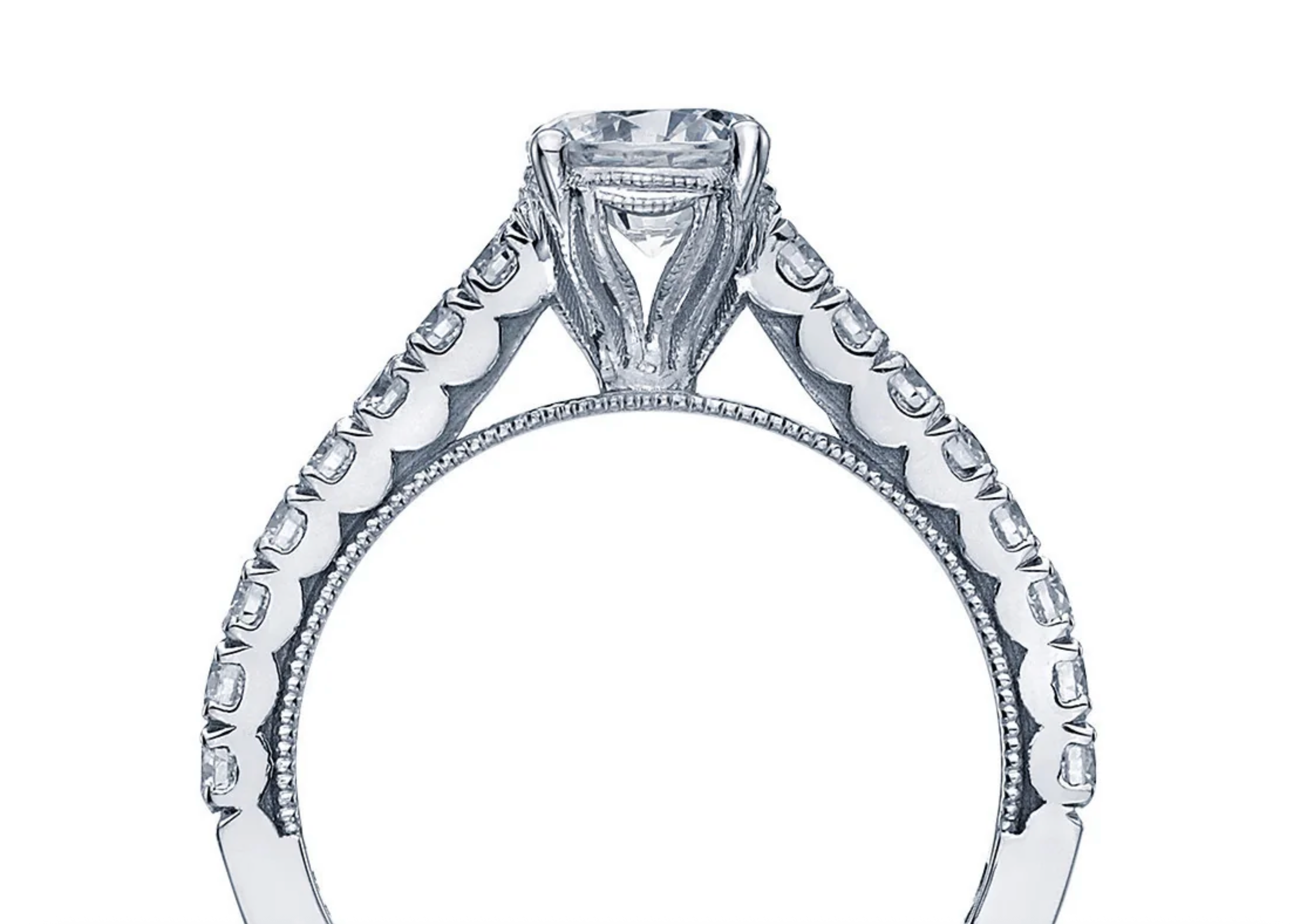 With a round center stone at the top, this French cut style setting glows with round diamonds along the ceiling. A clean crescent profile adds the Tacori touch.