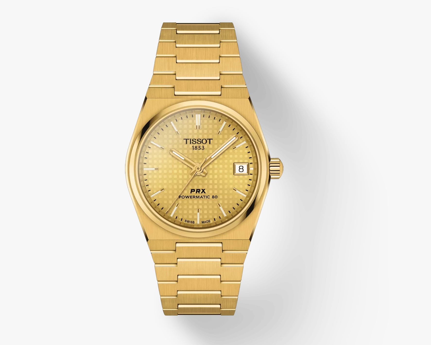 Tissot PRX 35mm Powermatic 80, a harmonious blend of nostalgic glamour and contemporary ingenuity. This 35mm watch features a high-quality gold-PVD case and a striking gold coloured dial. The gold variant, bold and purposeful, brings an undeniable dash of audacity to this automatic model. The waffle dial pattern lends further distinction to this timepiece. With water resistance up to 100 meters and a Nivachron™ balance hairspring, the PRX is an exquisite piece for those who appreciate the art of watchmaking. The satin-finish steel bracelet with a triple-blade folding steel clasp guarantees unyielding comfort. Be bold with the Tissot PRX 35mm Powermatic 80 in gold-PVD.