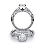 VENETIAN-5003 engagement ring features pave' set round brilliant-cut diamonds in a beautiful vintage style twisted shank. Personalize the ring to hold any diamond cut desired giving and illusion of a floating center. The handcrafted lace and Verragio sign