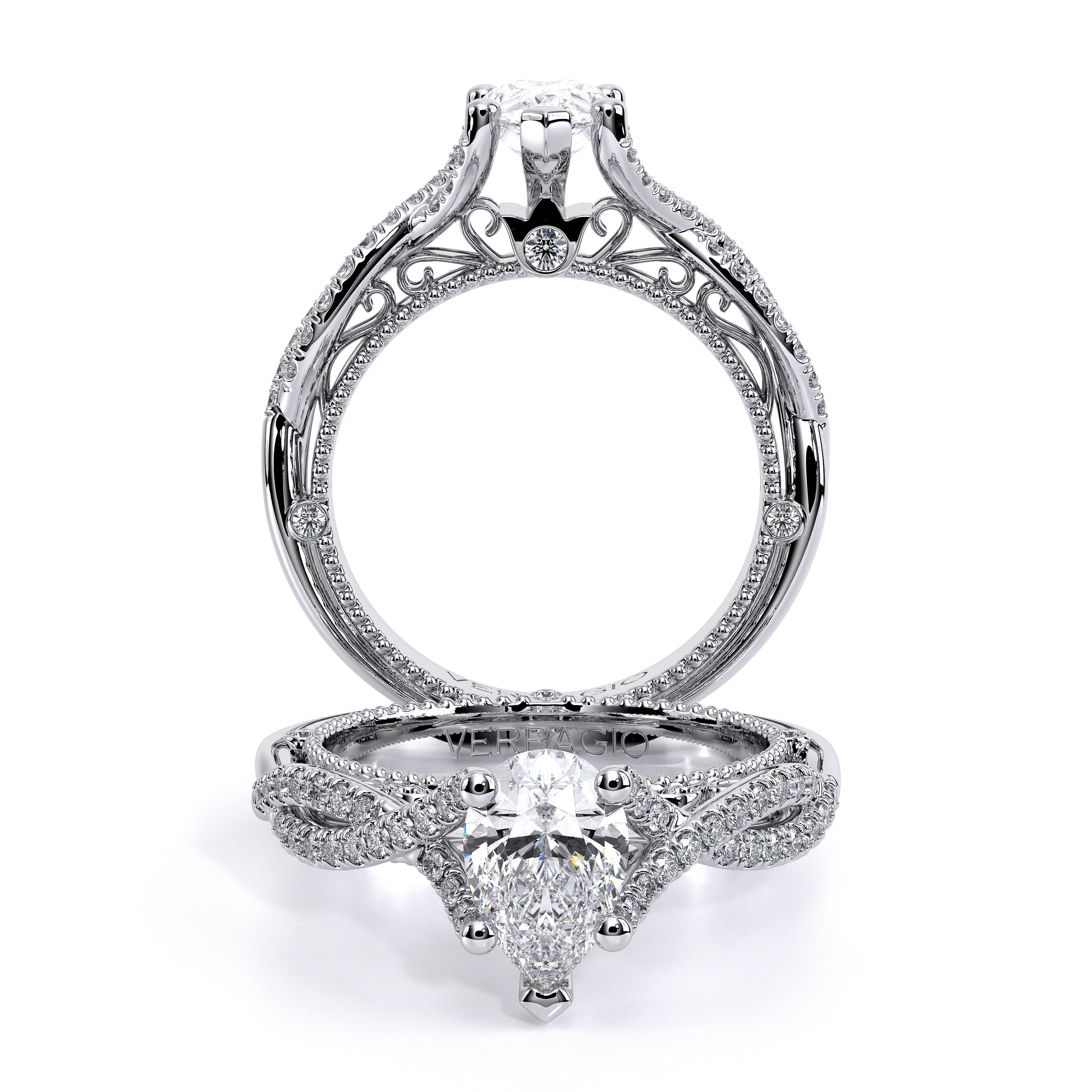 VENETIAN-5003 engagement ring from the Venetian Collection features round brilliant-cut diamonds pave set in a twisted shank enhancing any center shape of your choice in a floating design. Our beautiful Venetian lace and Verragio signature beading complet