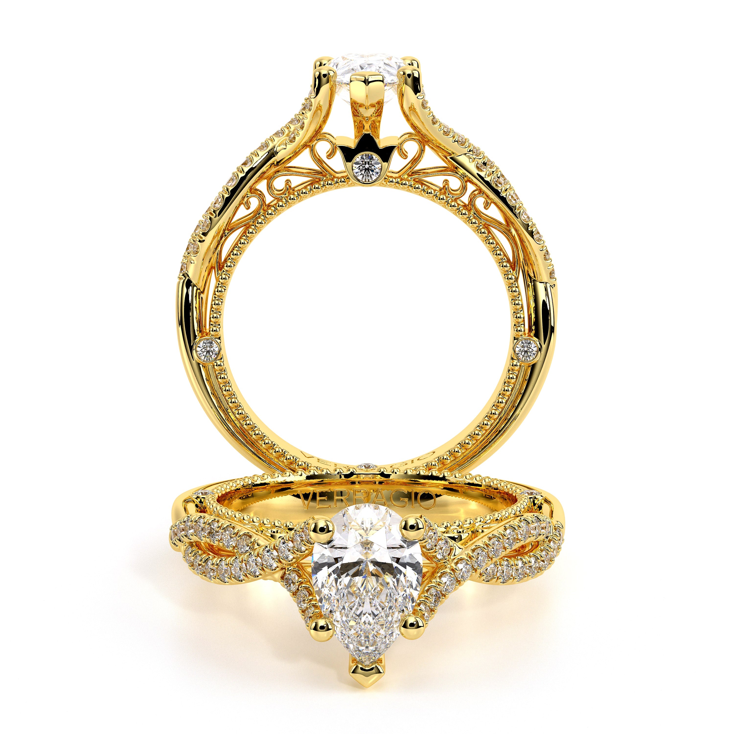 VENETIAN-5003 engagement ring from the Venetian Collection features round brilliant-cut diamonds pave set in a twisted shank enhancing any center shape of your choice in a floating design. Our beautiful Venetian lace and Verragio signature beading complet