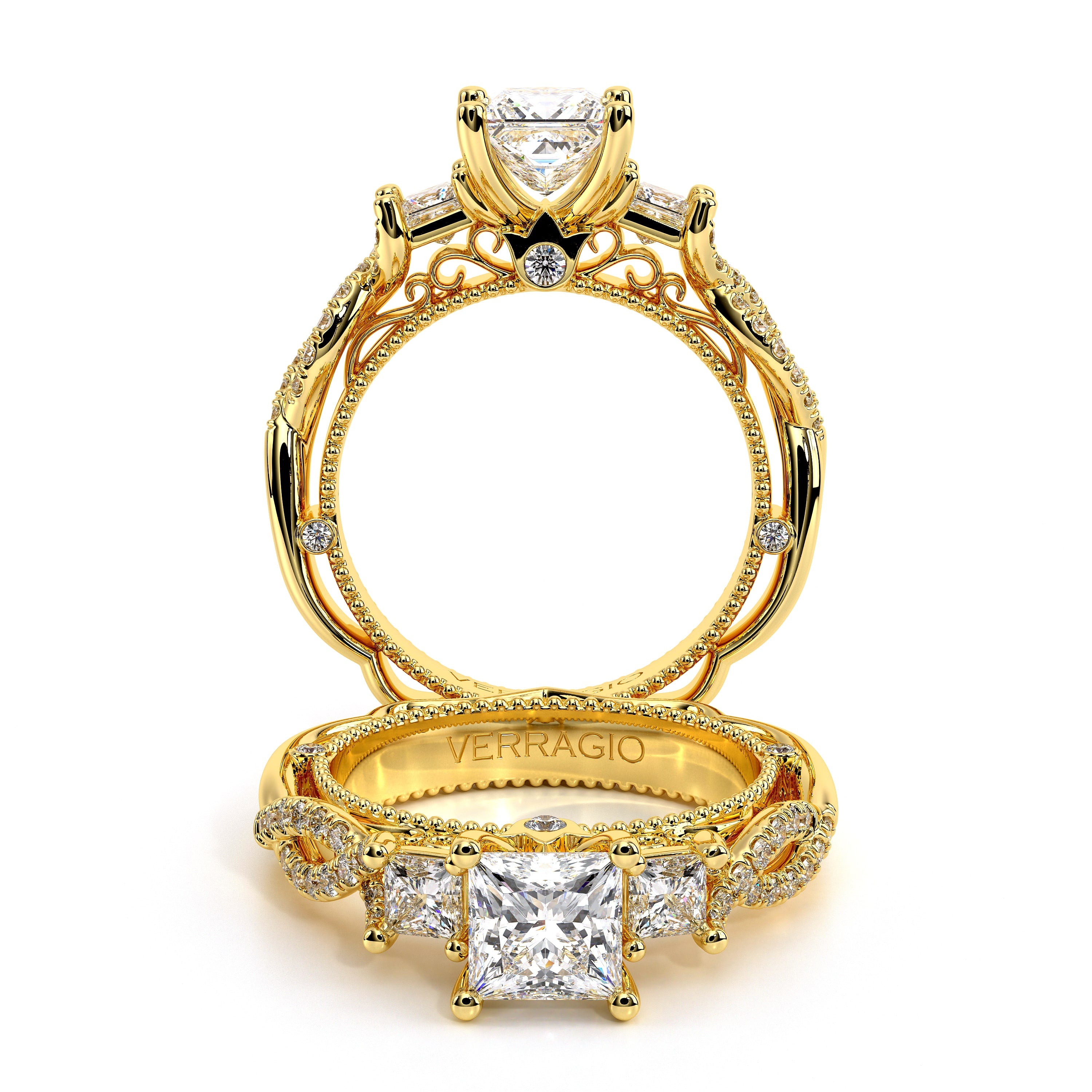 VENETIAN-5013P is a timeless representation of a three stone diamond engagement ring featuring two princess side diamonds on a twisted shank with round brilliant diamonds all coming together in perfect harmony. A beautiful handcrafted lace and Verragio si