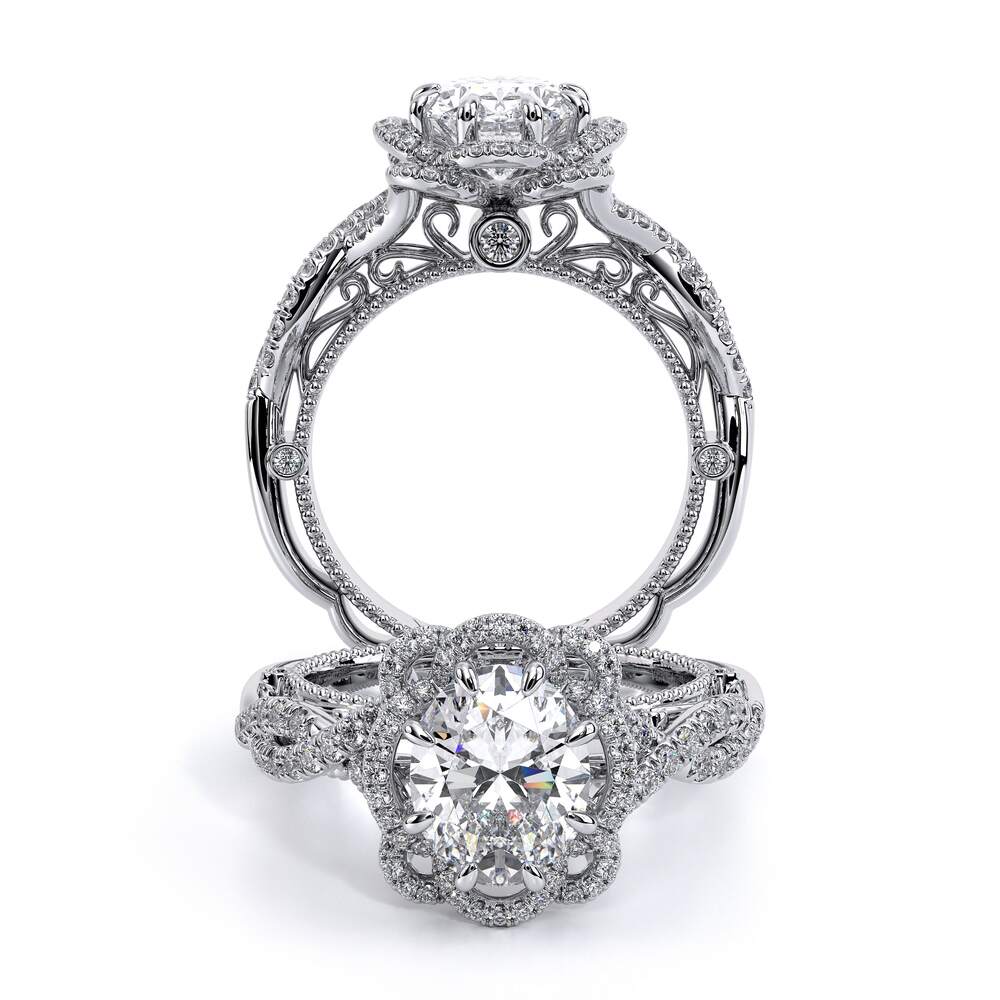 VENETIAN-5051OV engagement ring features our beautiful Verragio Floret halo modified for an Oval center along with a twisted shank encrusted with round brilliant diamonds. An intricately crafted lace design along with our Verragio signature beading furthe