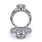 VENETIAN-5051R engagement ring features our beautiful Verragio floret halo with a twisted shank encrusted with round brilliant diamonds. An intricately crafted lace design along with our Verragio signature beading further enhances this gorgeous piece and