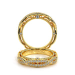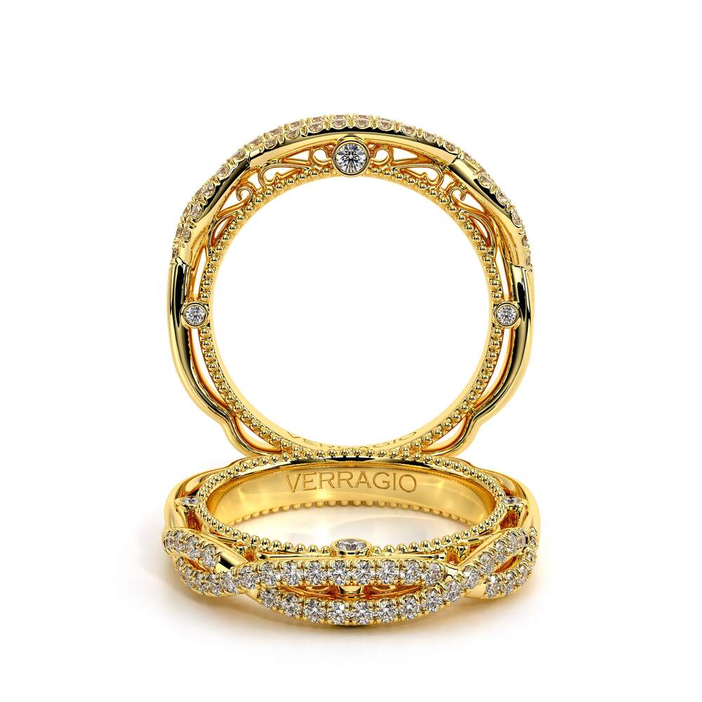 VENETIAN-5051W from the Venetian Collection features a twisted band with round brilliant diamonds. This beautiful wedding band profiles three bezel set round diamonds on each sides placed perfectly in sync with our signature lace and beading. Opt for a tw