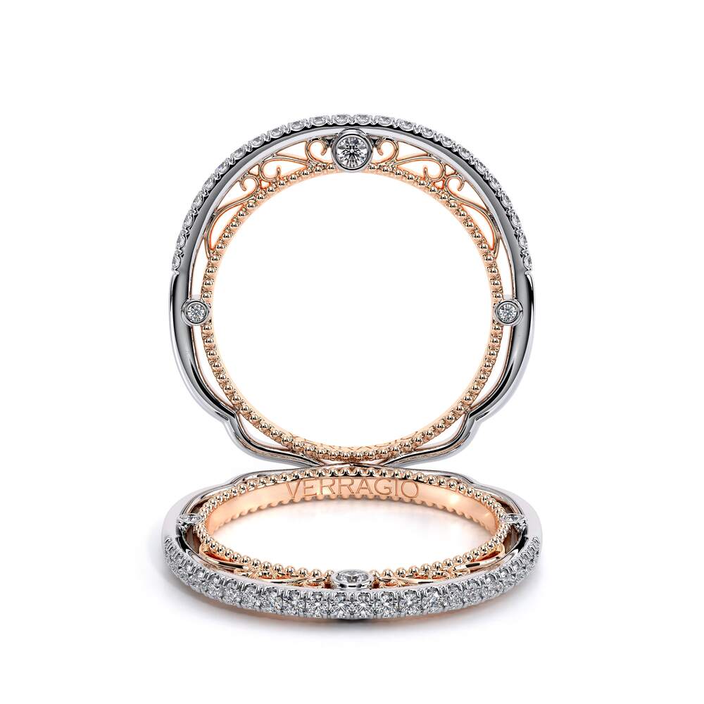 VENETIAN-5051WSB from the Venetian Collection features a delicate straight band set with round brilliant diamonds. The inside profile showcases three bezel set round diamonds on each side infused with lace and signature beading.