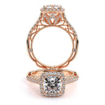 VENETIAN-5061CU engagement ring from the Venetian Collection features a unique diamond adorned basket in rose gold topped with a cushion shaped single halo made for a round center. A delicate straight shank encrusted with round brilliant diamonds complete